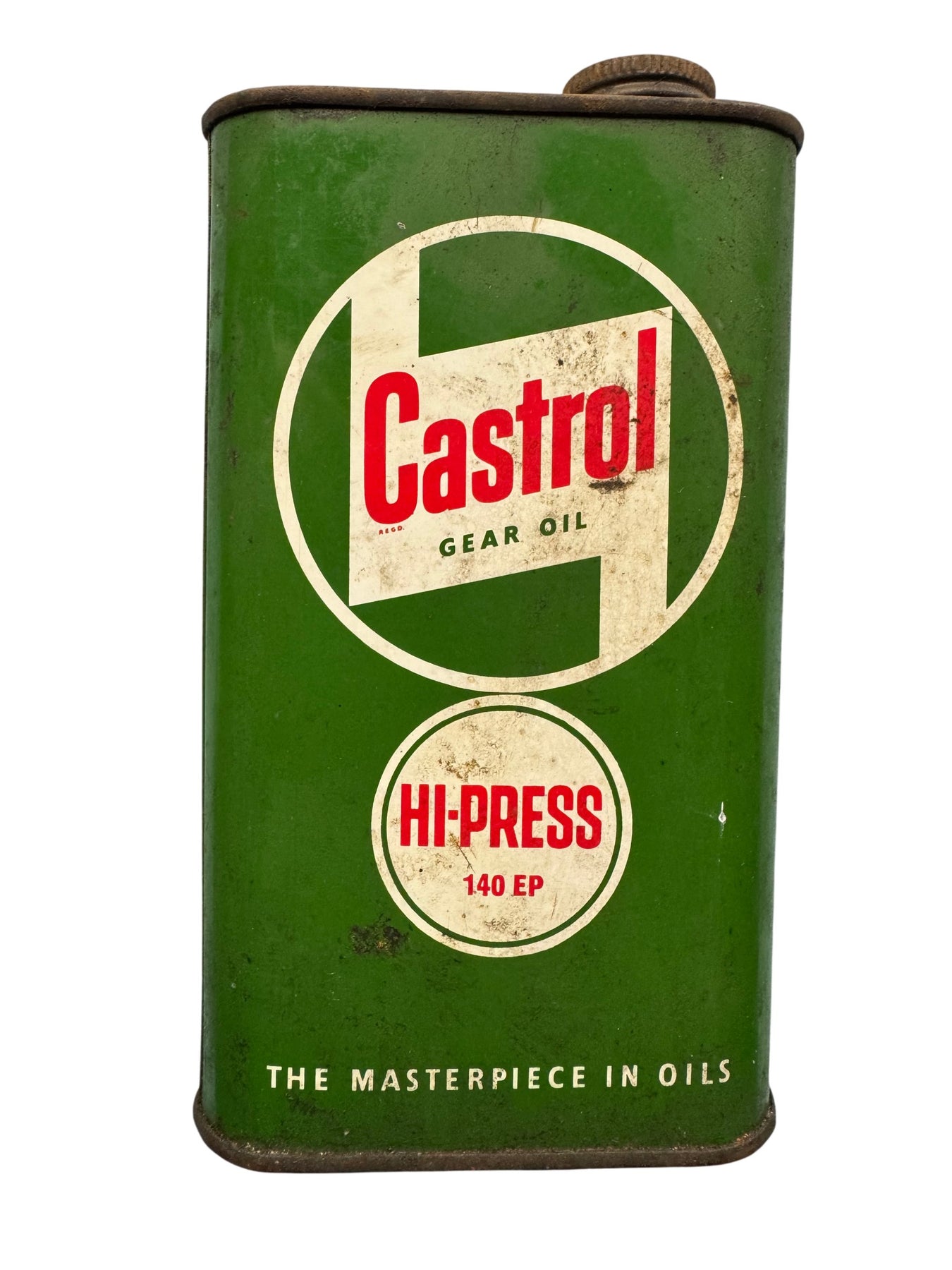 Vintage Castrol gear oil tin labeled Hi-Press 140 EP. This tin is empty but is designed to provide efficient lubrication and reduce wear of gear teeth and bearings. Classic green tin with Castrol branding.