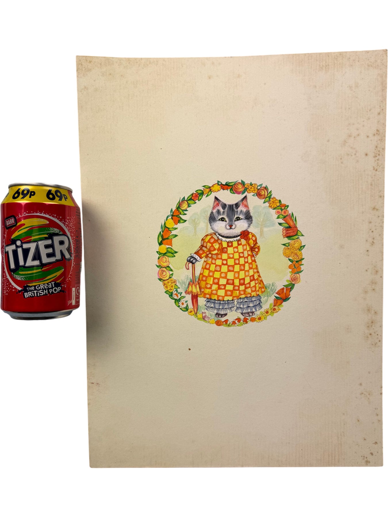 Cat illustration printed on high-quality watercolour board. Features a colourful floral border around the central cat figure. Made by Daler & Rowney LTD with premium watercolour card. Belinda Lyon Design