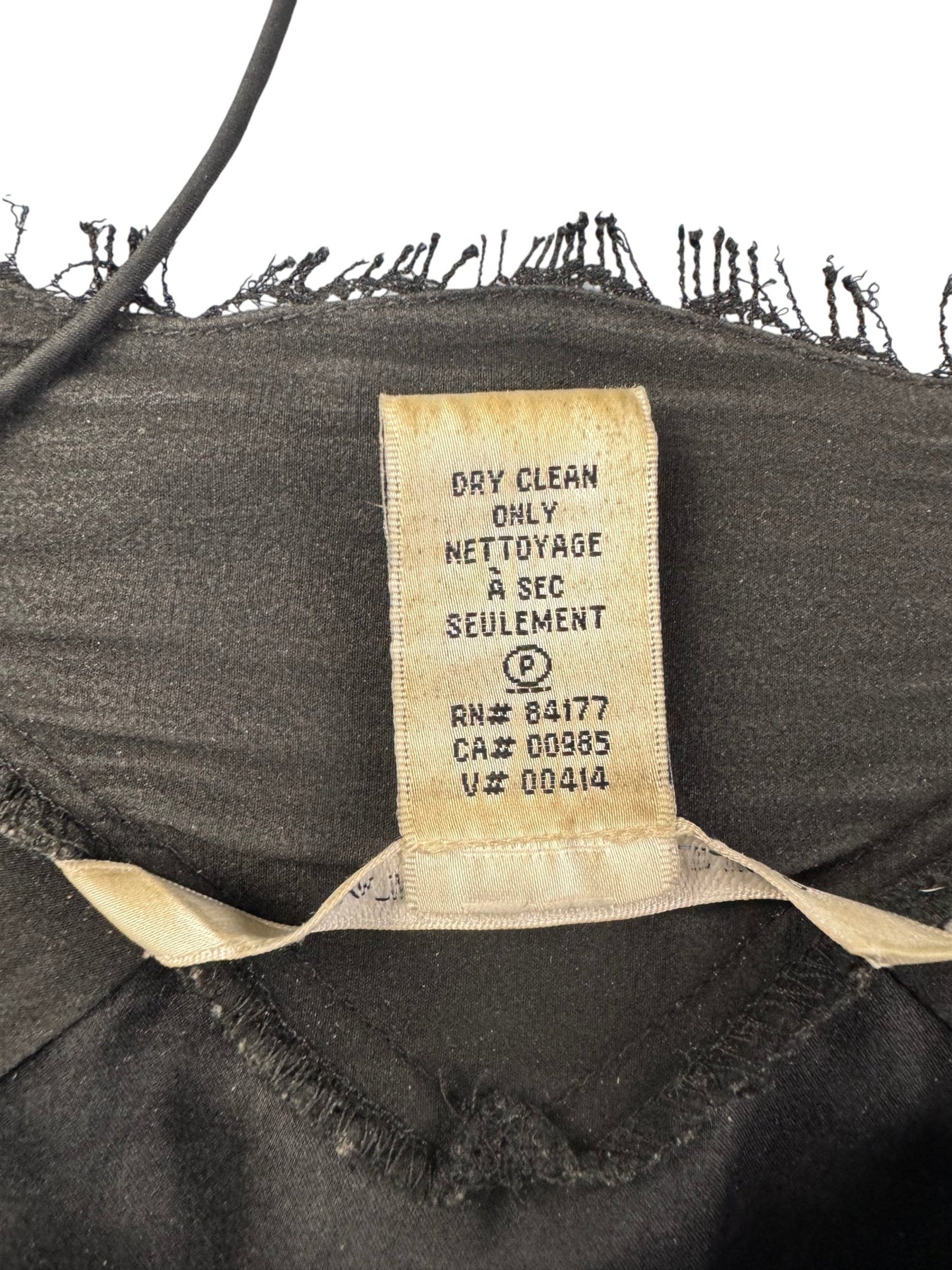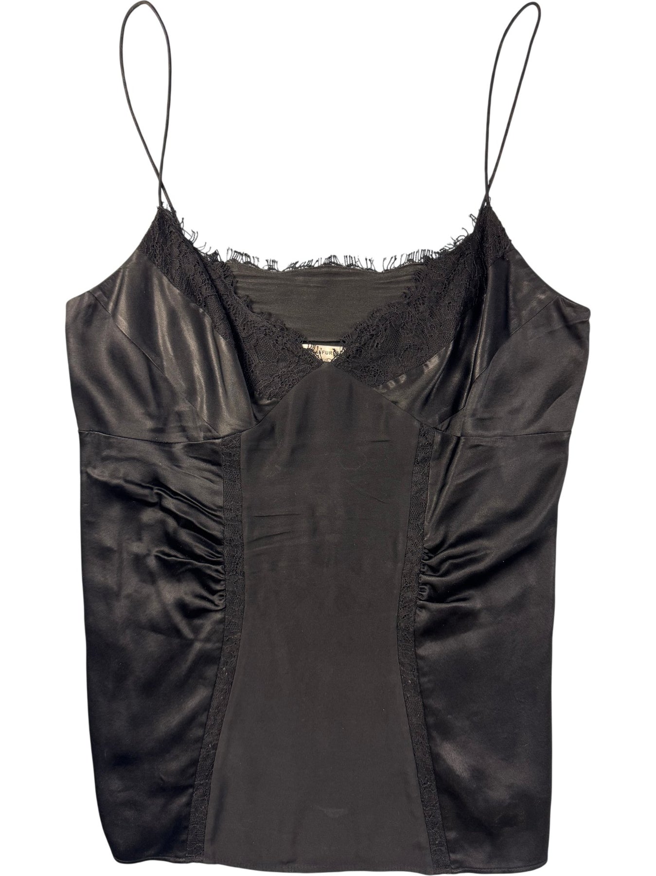 Black camisole with spaghetti straps and lace details. Made from 95% silk and 5% spandex, offering a smooth and stretchable fit. Features a nylon lining, enhancing comfort.