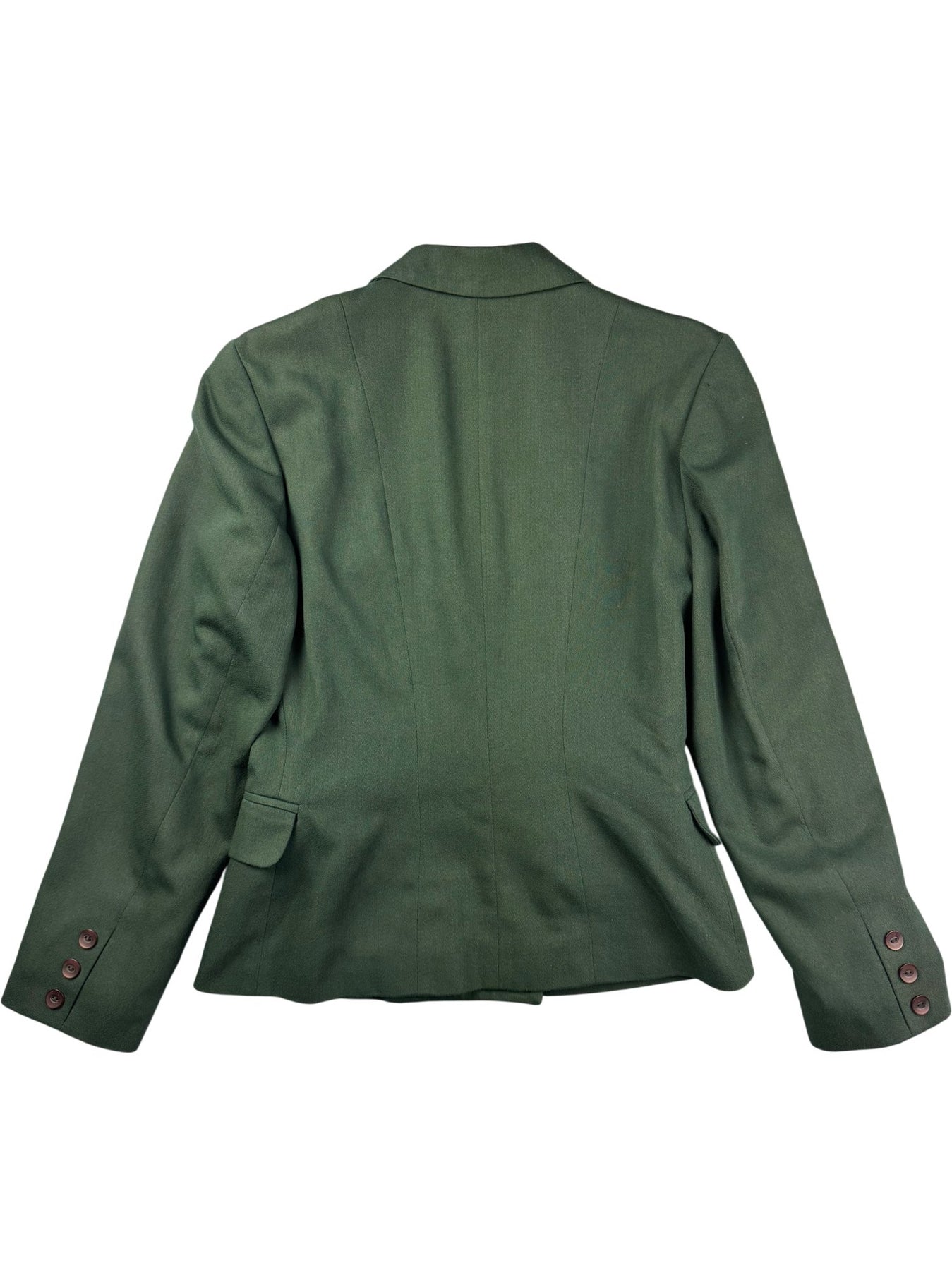 Green double-breasted jacket with notched lapels and two buttons. Matching green skirt with a rear slit. Made from 50% polyester and 50% viscose. Lining is 100% polyester. Made in England. Dry clean only.