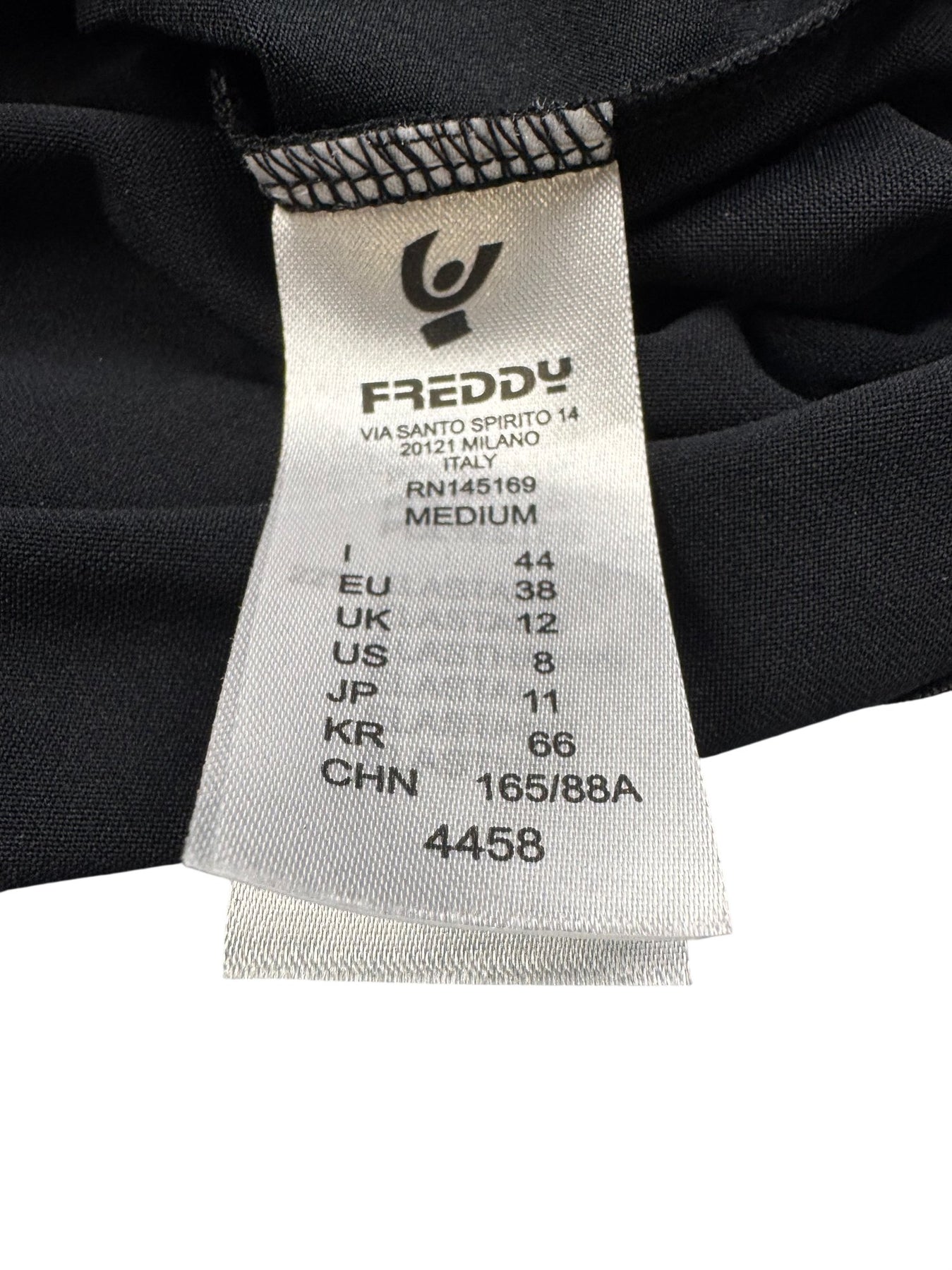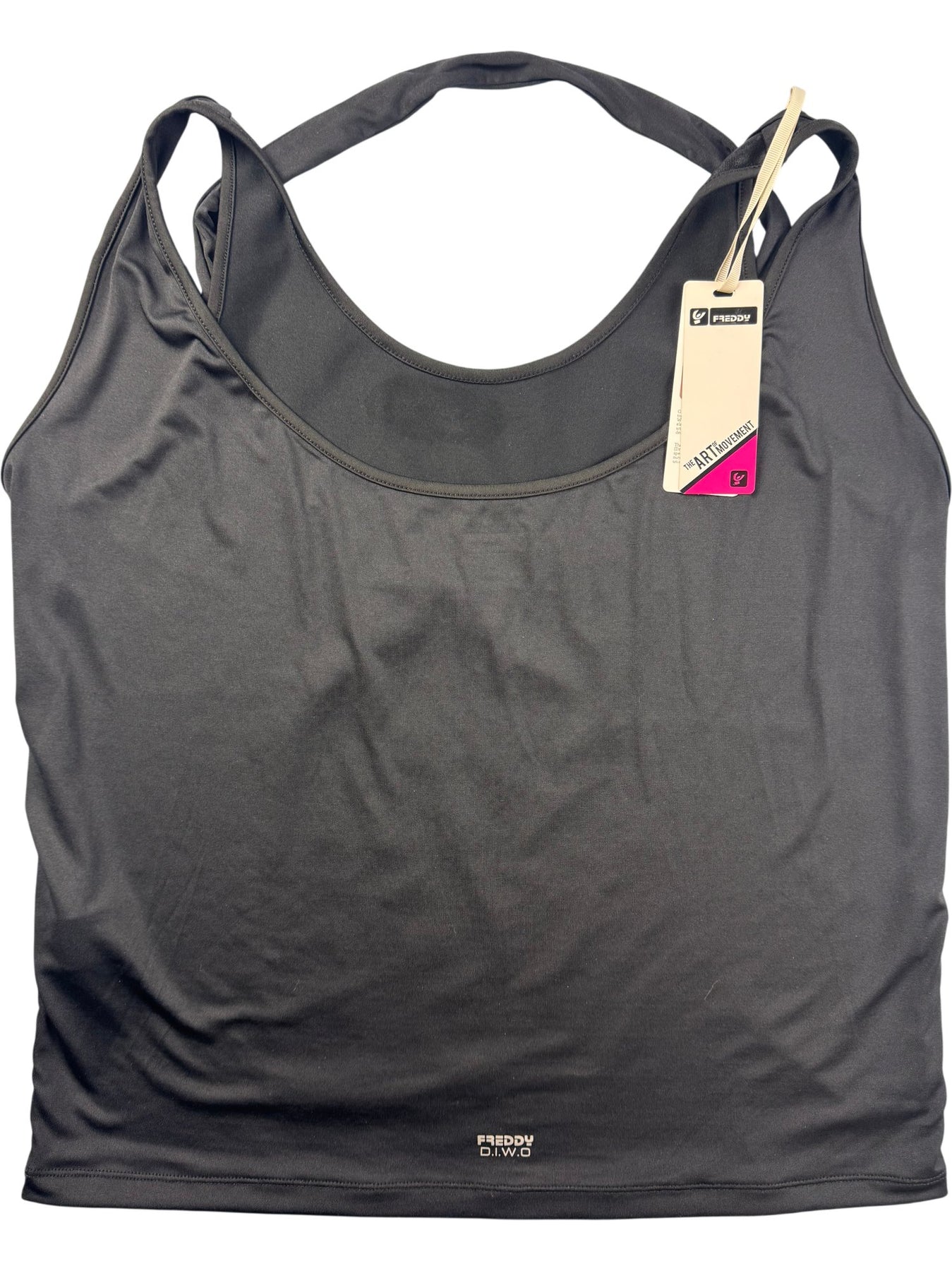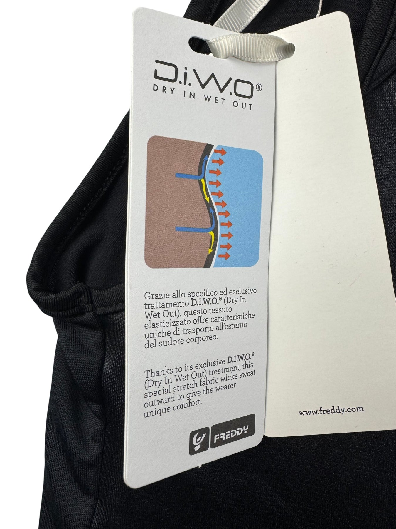 Black tank top made from 78% polyester and 22% elastane. Features moisture-wicking DIWO technology for enhanced comfort. Distinctive Freddy branding on the front.