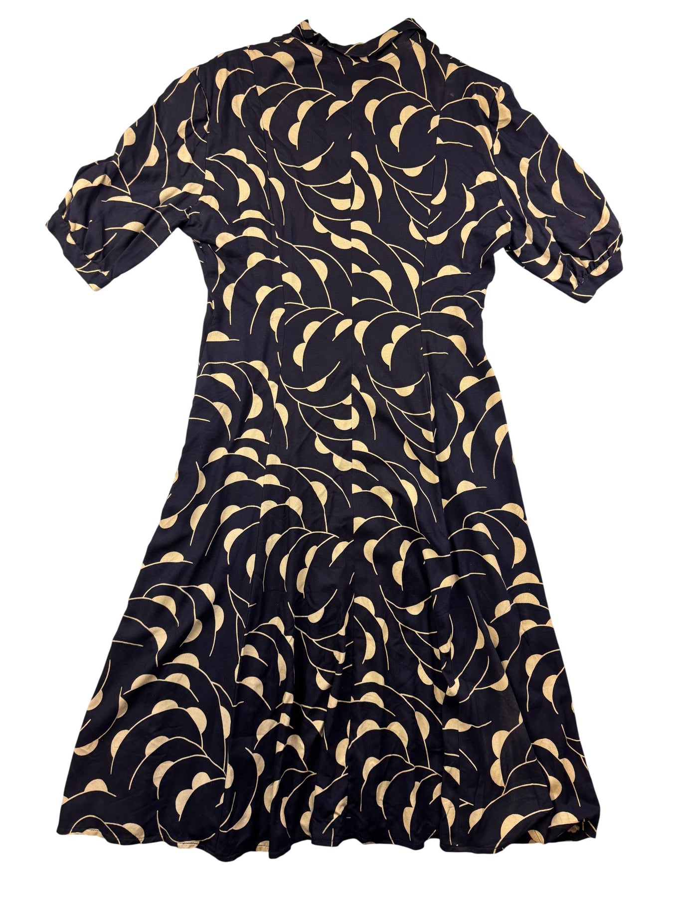 This dress features a distinctive abstract pattern with a button-up front. Made in England by Hobbs, it showcases a design flair by Marilyn Anselm.
