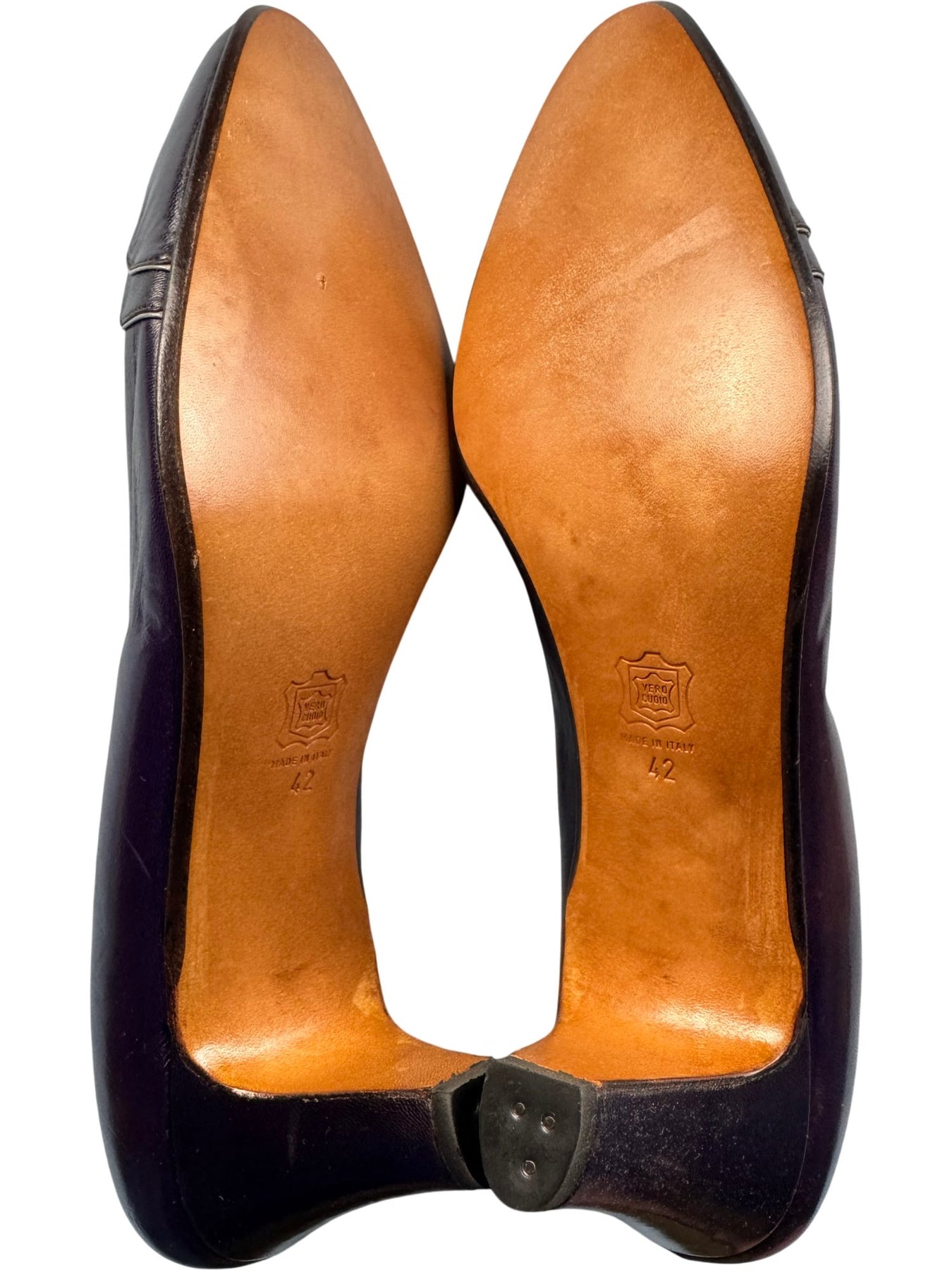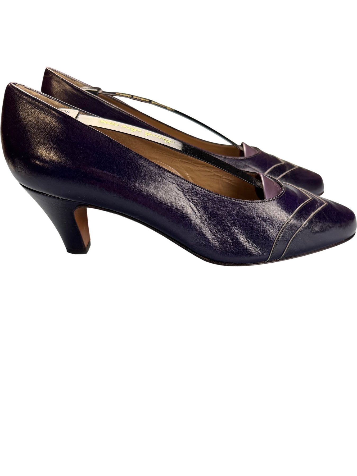Purple leather heels with a pointed toe and elegant v-shaped detailing. Made in Italy, featuring a sleek design with a mid-height heel.