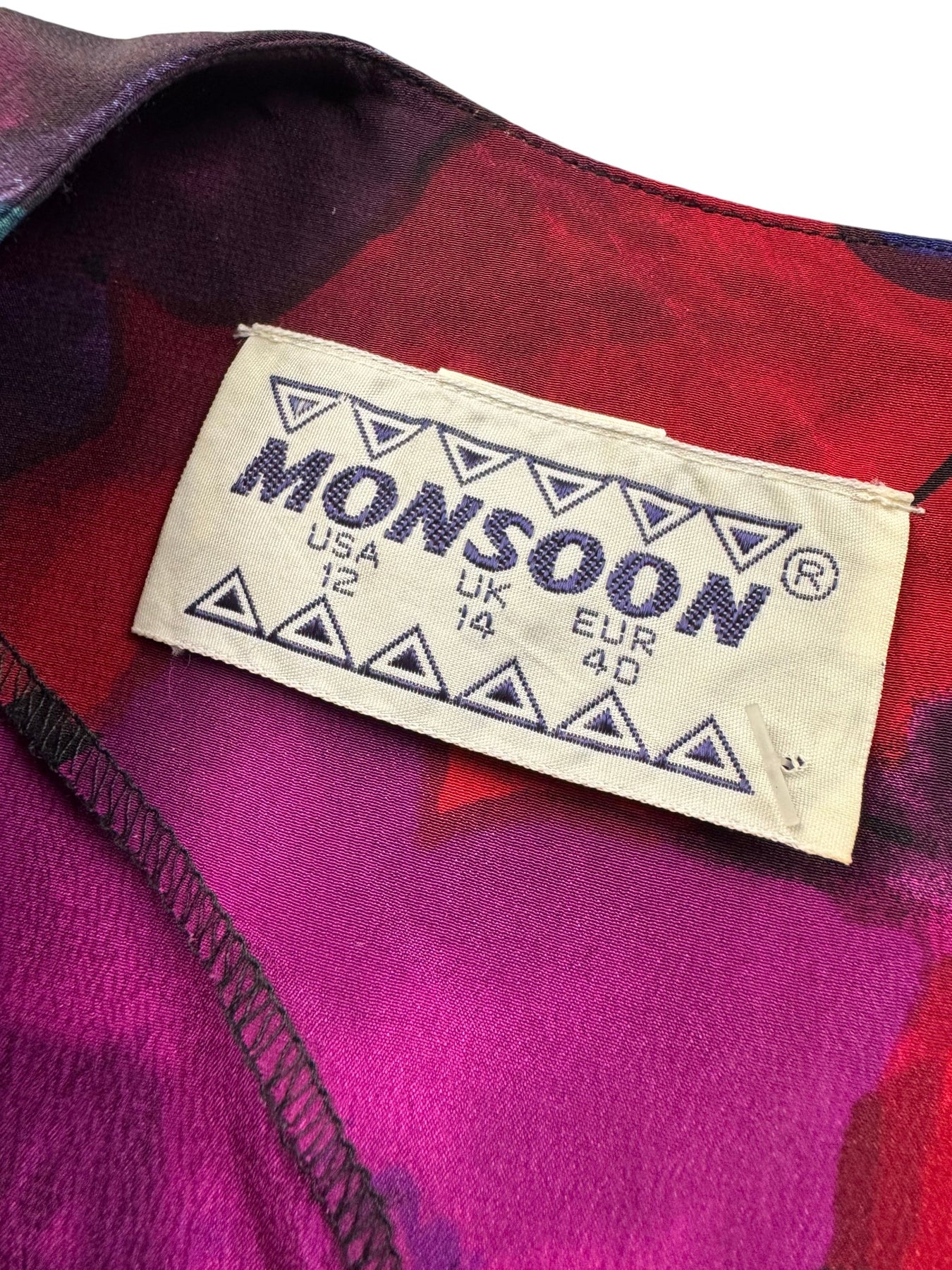 100% silk dress by Monsoon with a vibrant floral pattern. Features long sleeves and a round neckline. Made in Hong Kong.