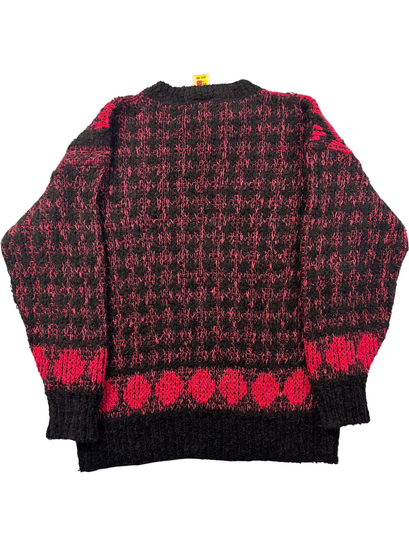 Geometric pattern sweater made by St Michael. Composed of 77% acrylic, 12% wool, 6% cotton, and 2% metallised fibres. Includes a blend of nylon, mohair, and polyester. UK made.