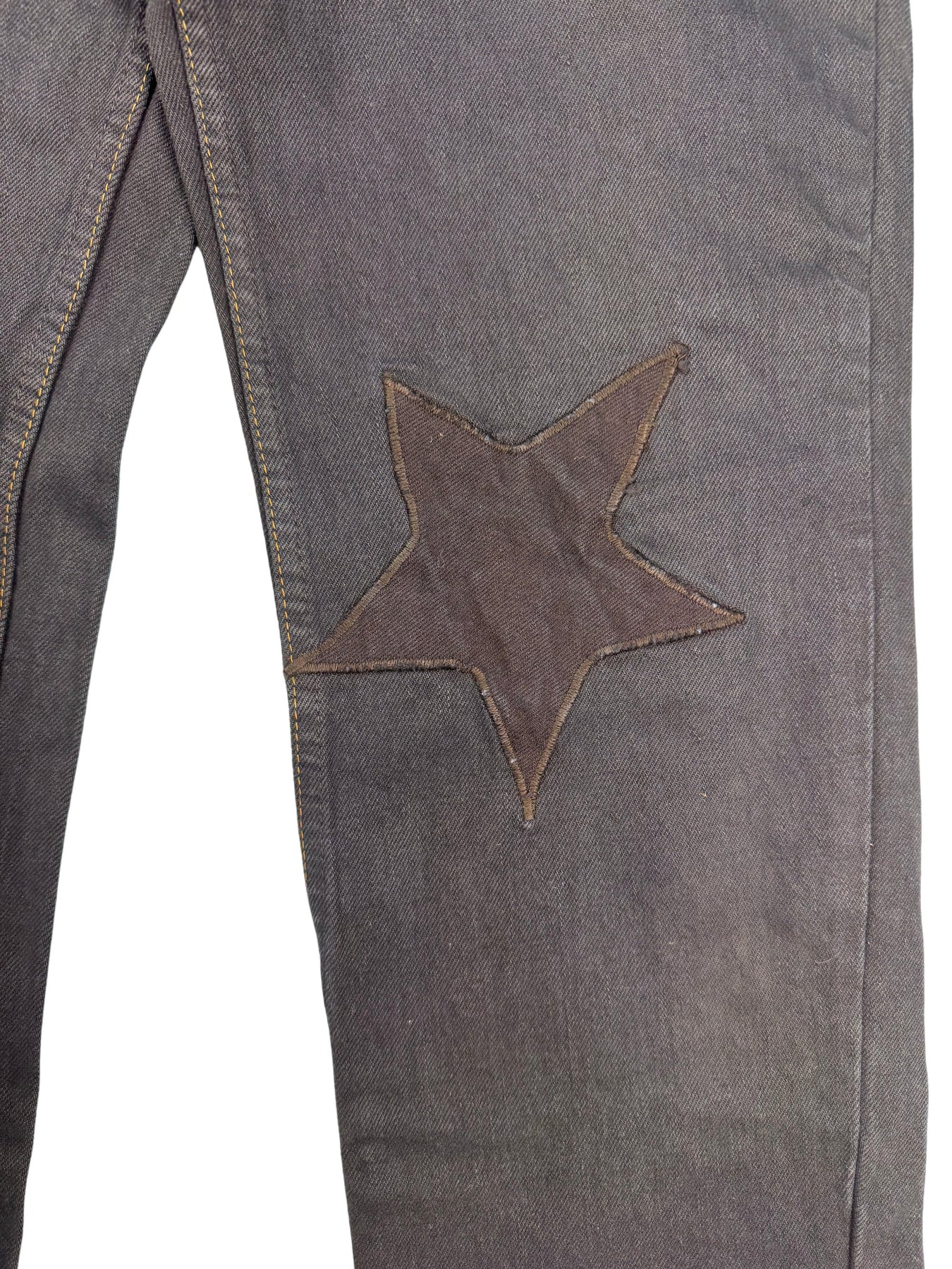 Black denim jeans featuring a distinctive star patch on the front. Traditional five-pocket style with belt loops. Made from durable denim fabric.