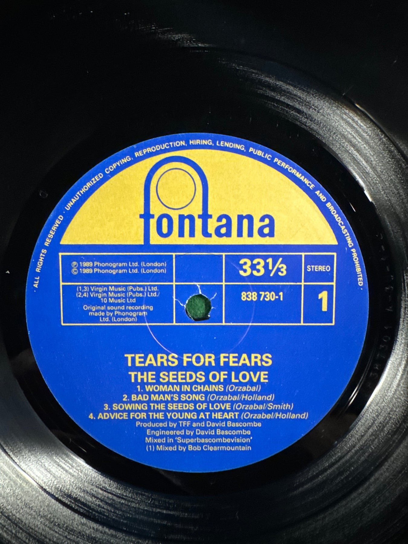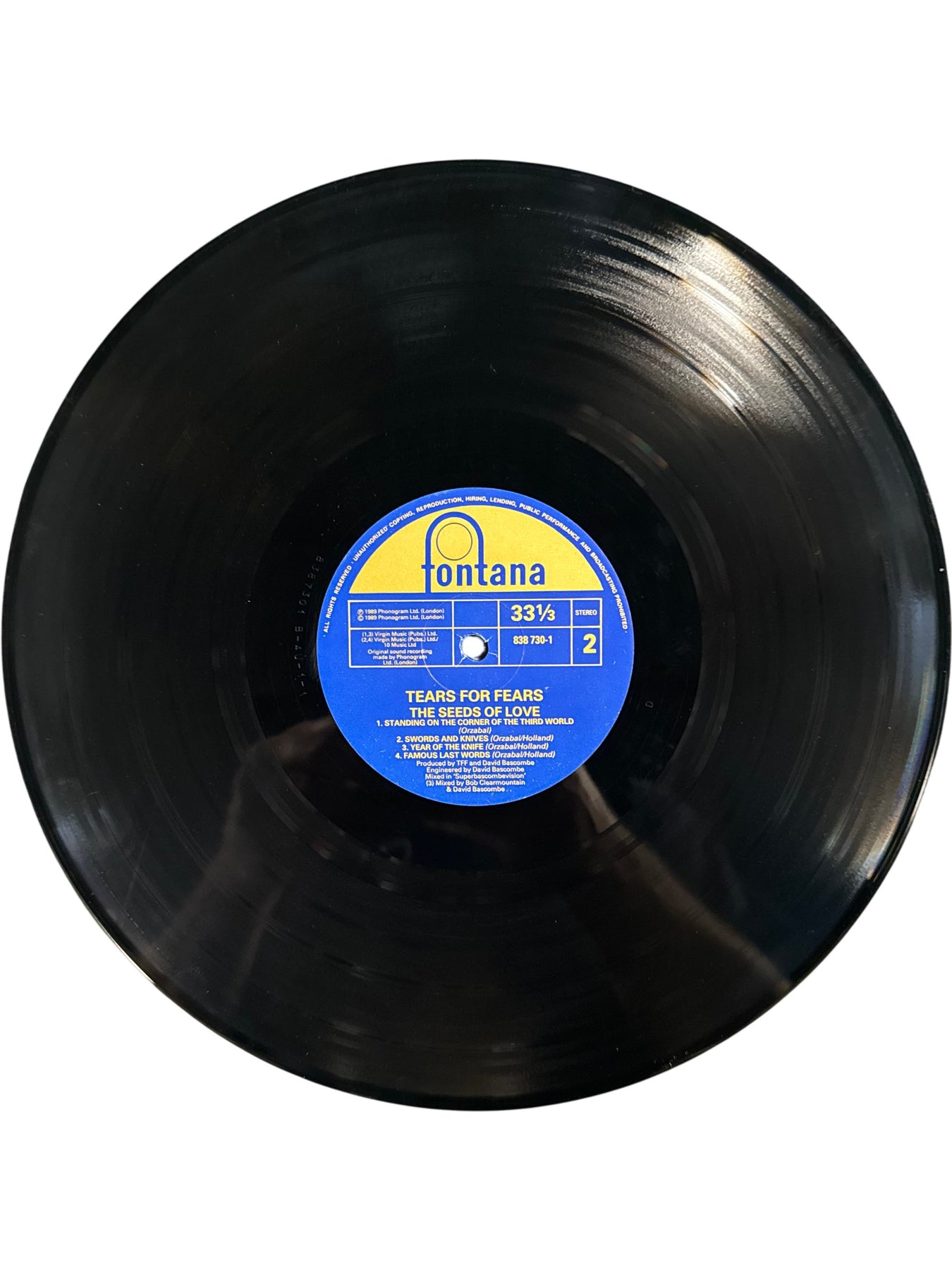 The album 'The Seeds of Love' by Tears for Fears features tracks such as 'Woman in Chains' and 'Sowing the Seeds of Love.' Released under the Fontana label, it plays at 33 1/3 RPM.
