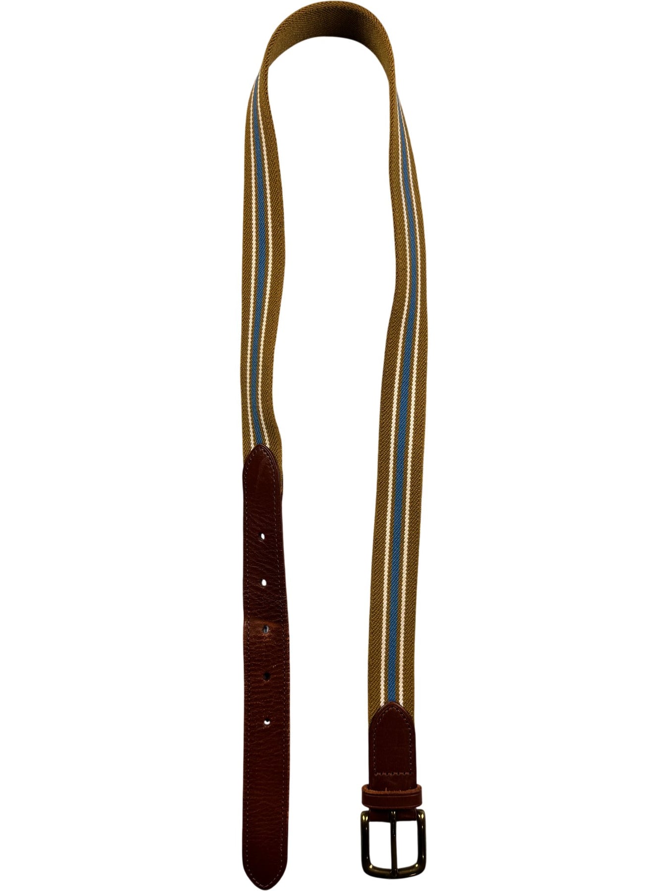 Canvas belt featuring a mustard and blue striped pattern, complemented by brown leather accents. Equipped with a solid brass buckle for adjustment.