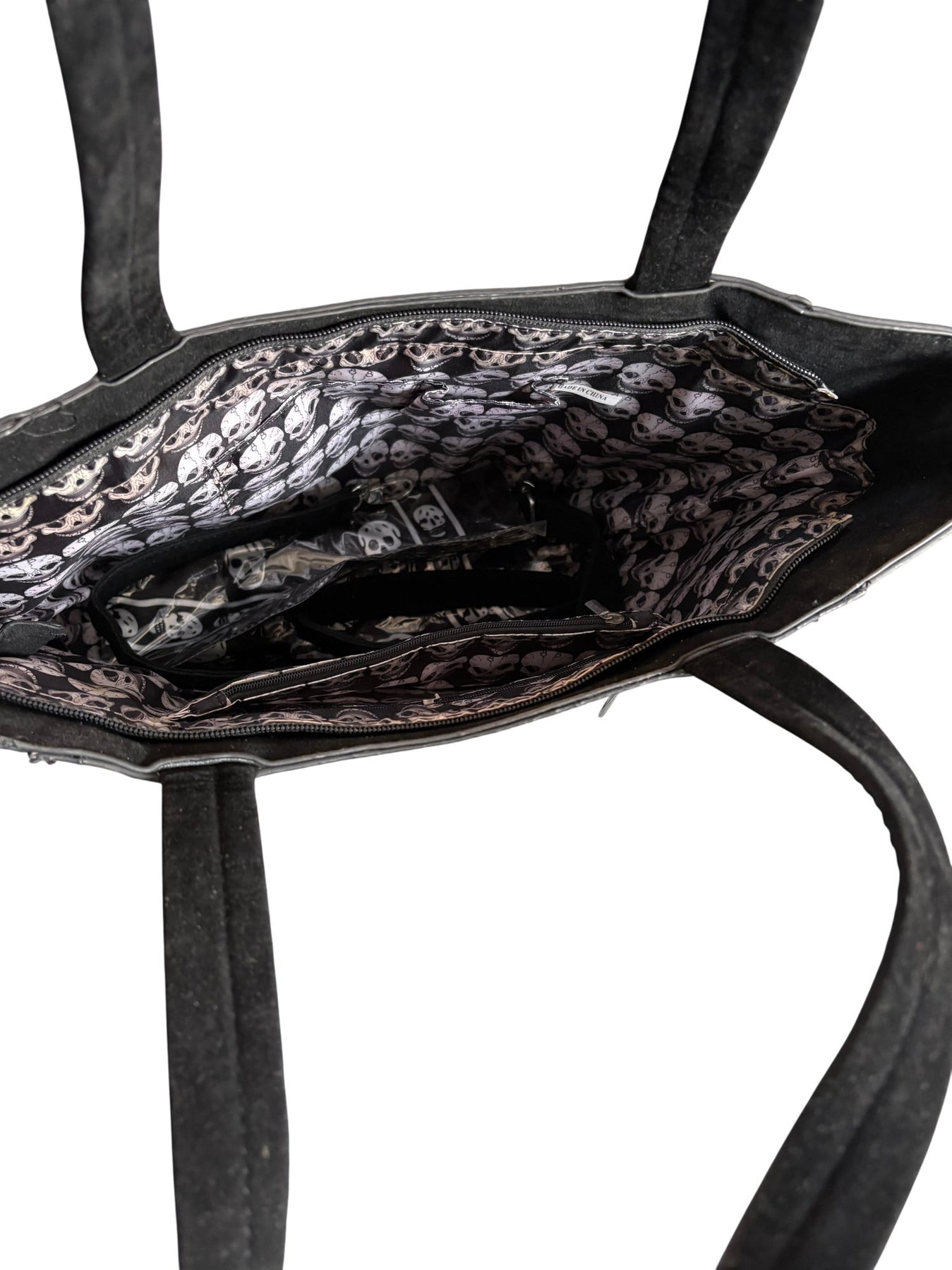 Black tote bag featuring a multicoloured skull design. Studded sides for added detail. Zipper closure with spacious interior and inner pockets.