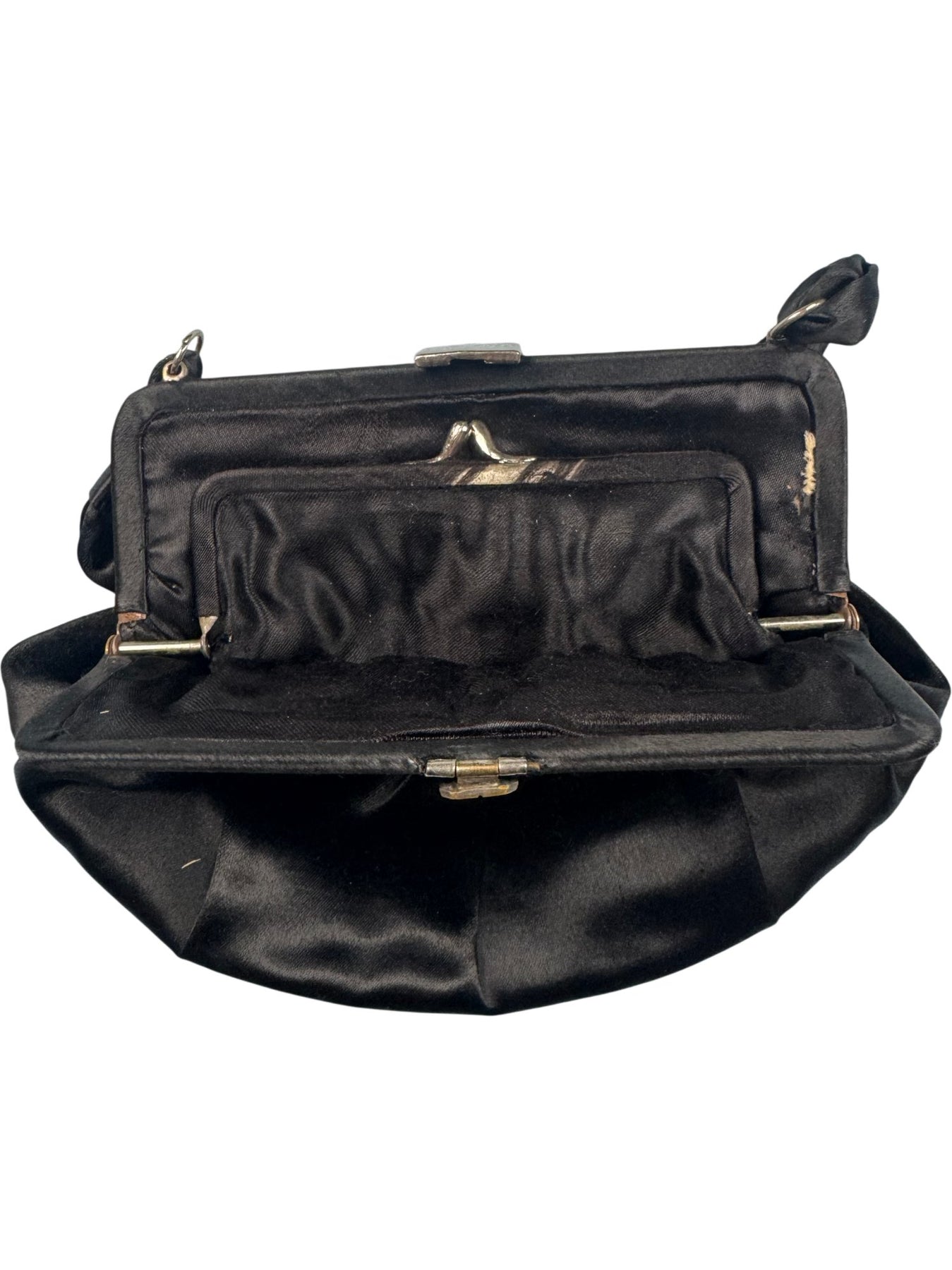 Elegant clutch bag made from smooth black satin material. Features a decorative clasp with silver-toned embellishments. Includes a satin handle for carrying convenience.