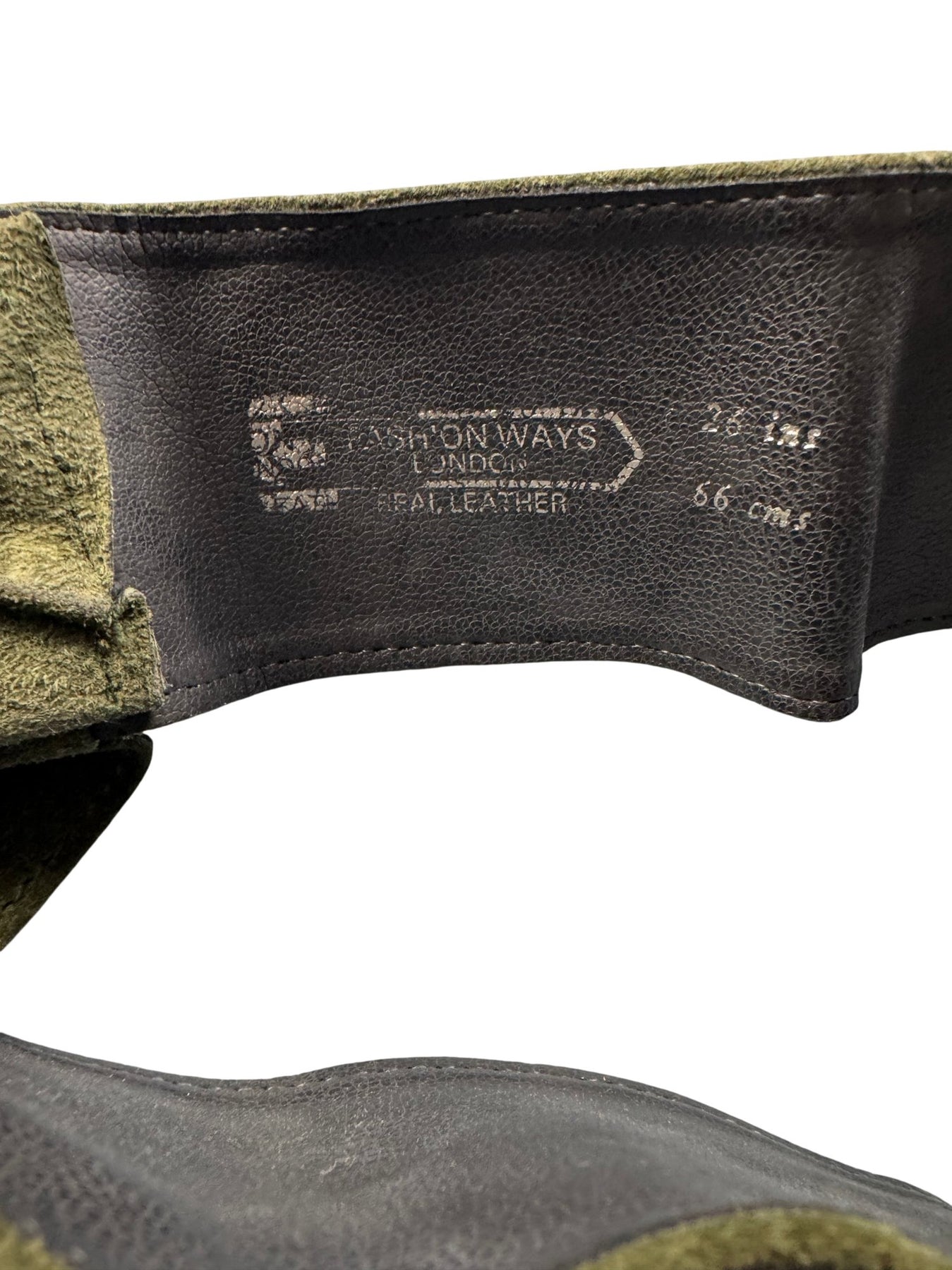 Real leather belt with a stylish gold buckle. Elegant olive green colour. Made in London by Fashionways.