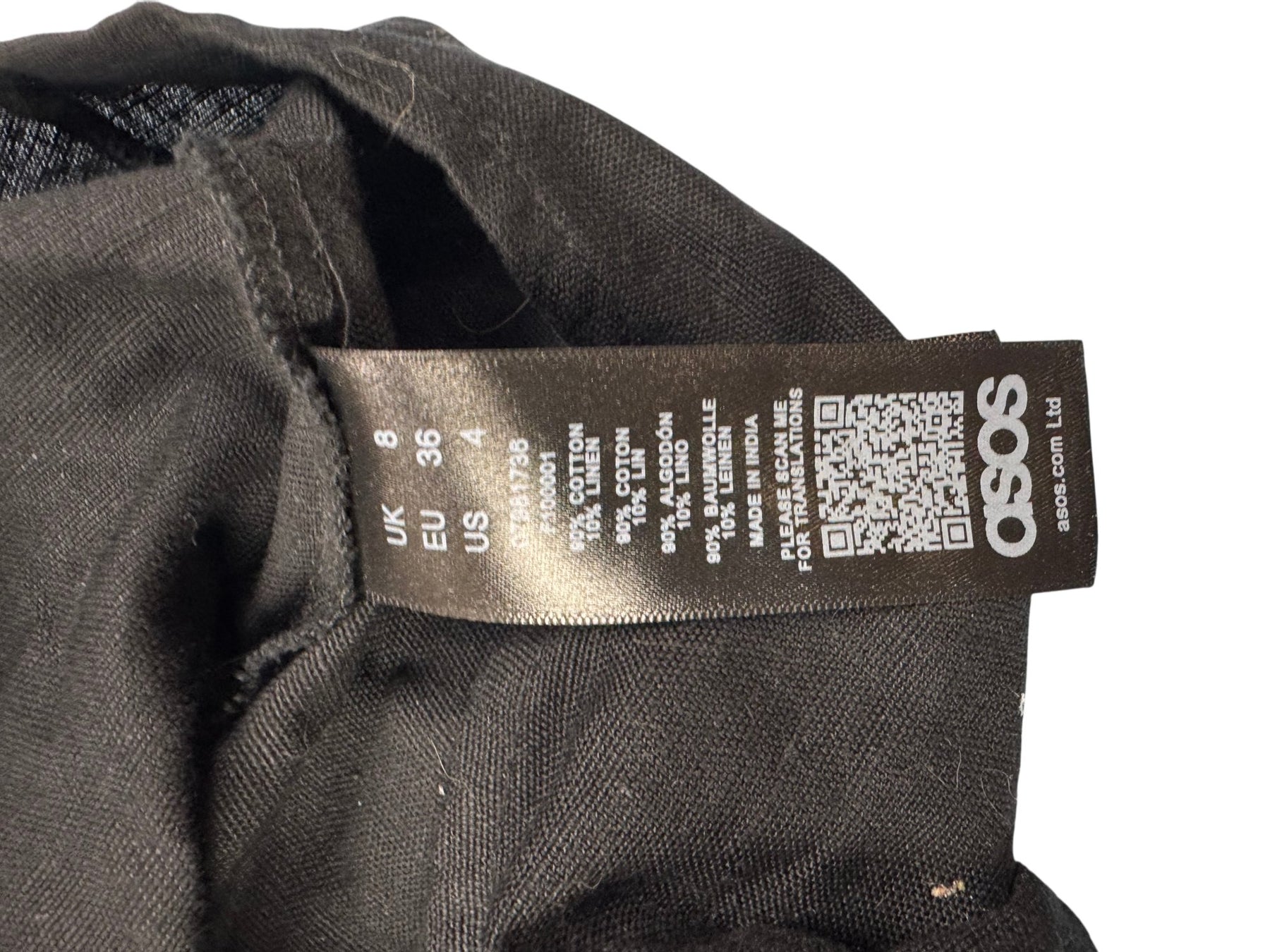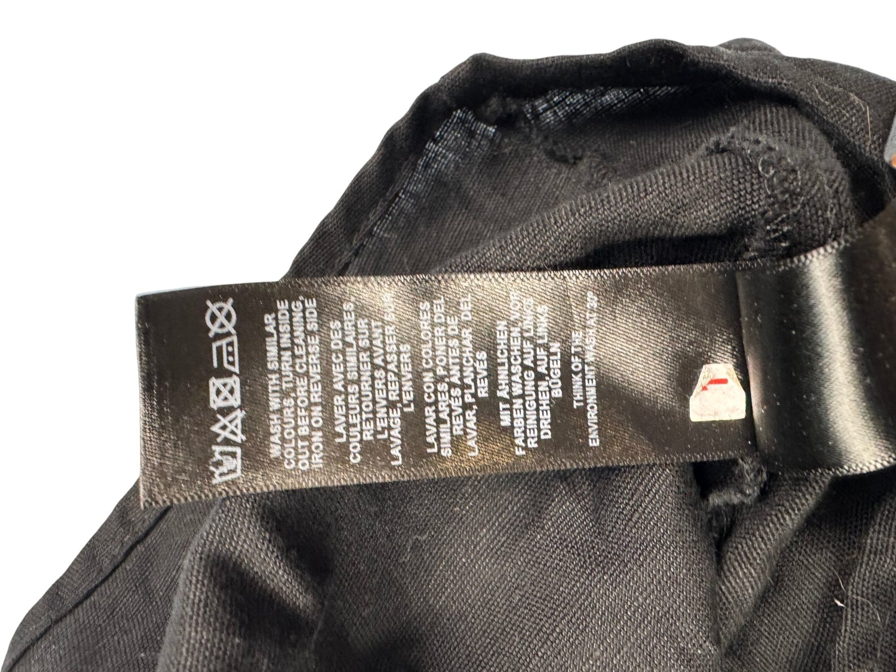 Black halter neck dress featuring a button-down front design with wooden buttons. Crafted from a blend of 90% cotton and 10% linen.