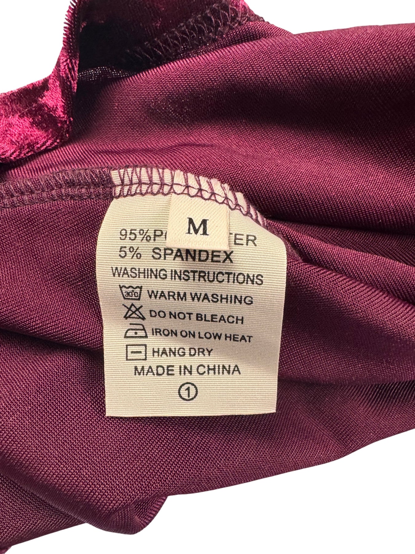 Red velvet dress featuring lace trim and adjustable straps. Made of 95% polyester and 5% spandex for a comfortable fit. Includes unique black lace detailing at the hem.