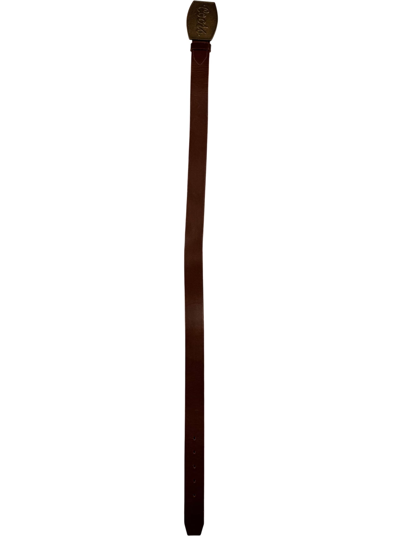This item features a brass belt buckle with the 'Coors' logo prominently displayed. It is attached to a brown leather strap, offering durability and a classic look. The belt includes multiple holes for adjustable fitting.