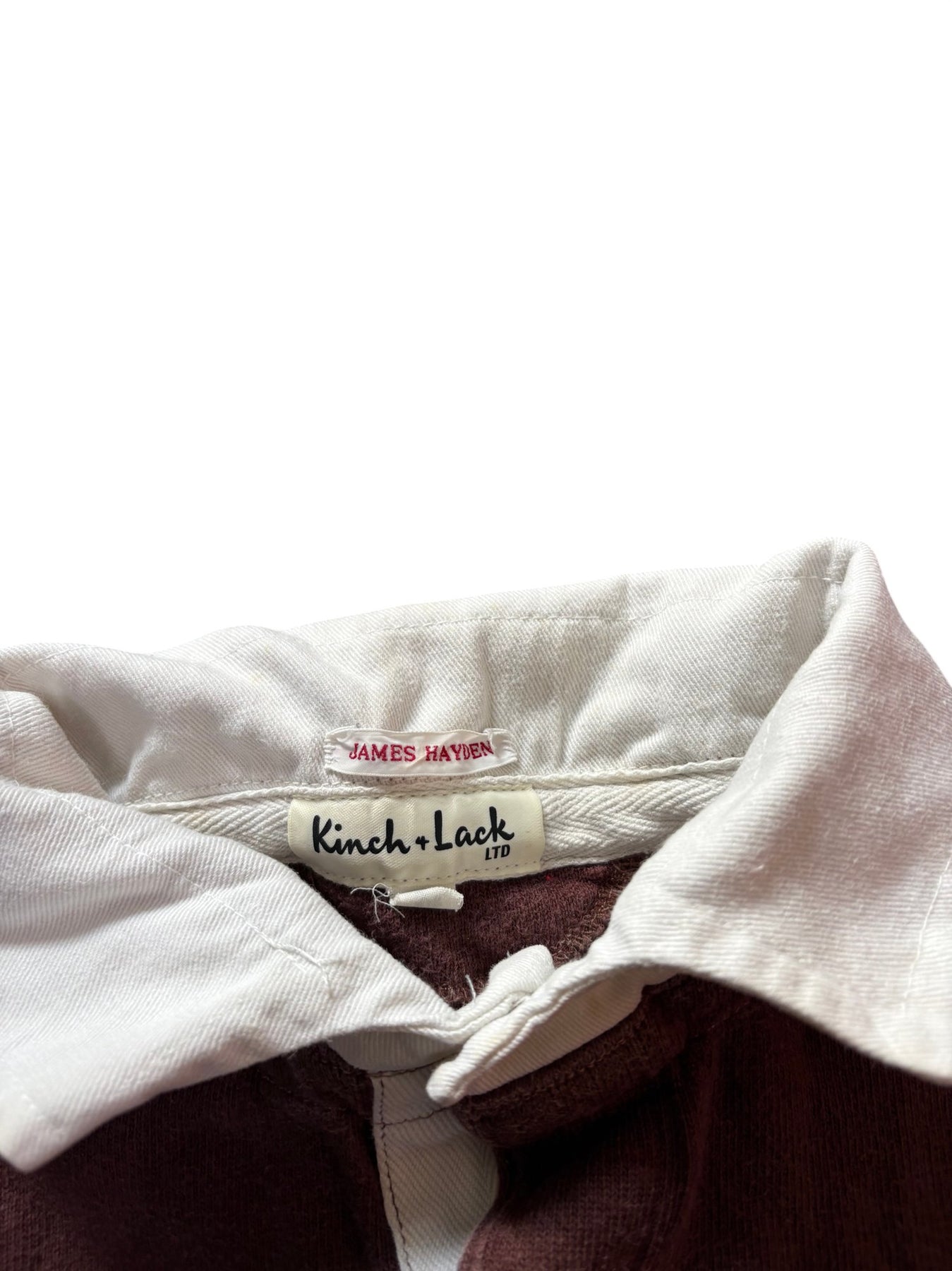 Maroon long-sleeve rugby shirt with white collar and buttoned placket. Made by Kinch Lack LTD. Features cuffed sleeves and a solid pattern.