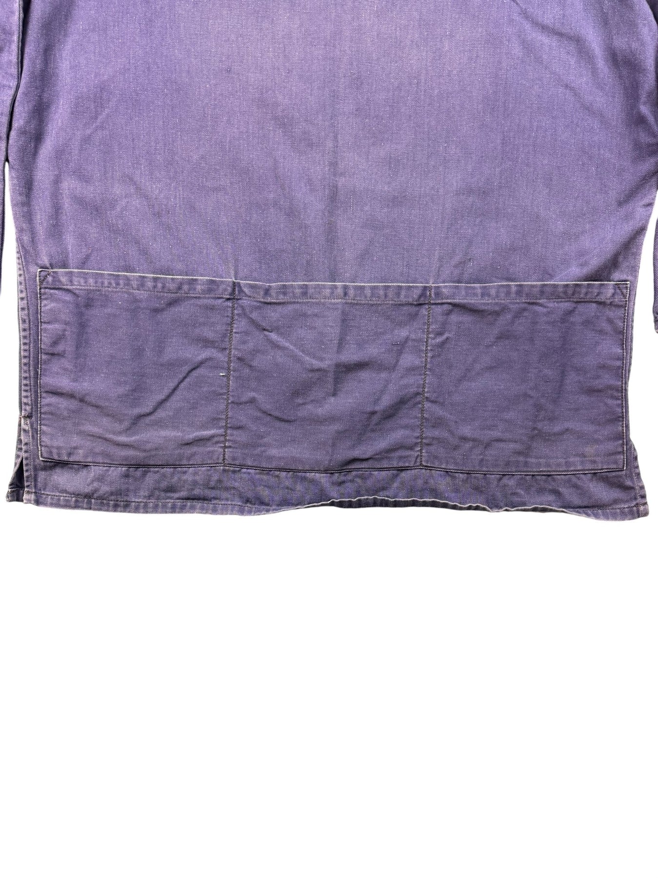 Classic 1960s workwear jacket in a unique purple fabric. Features a durable construction, with three large front pockets for practicality.