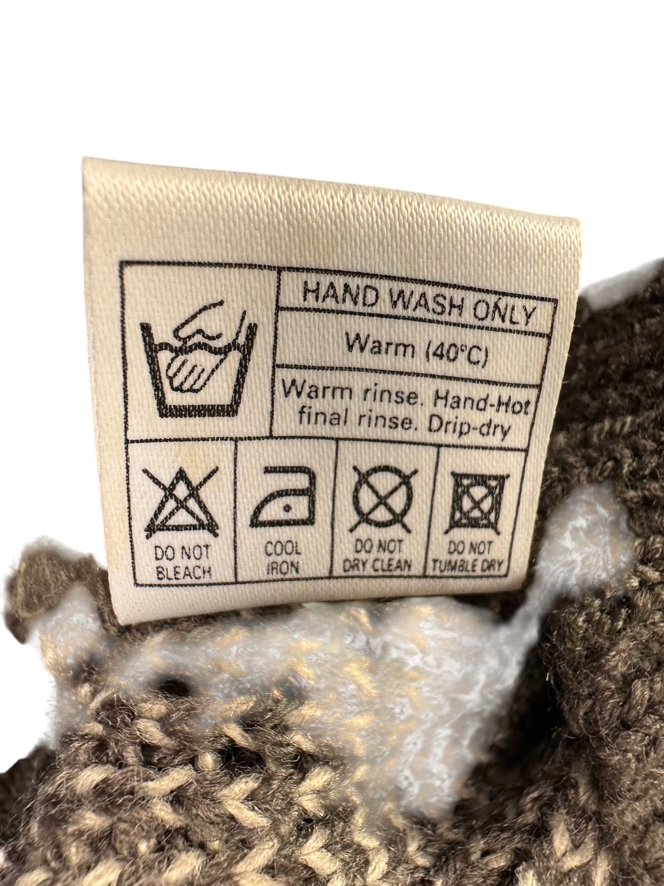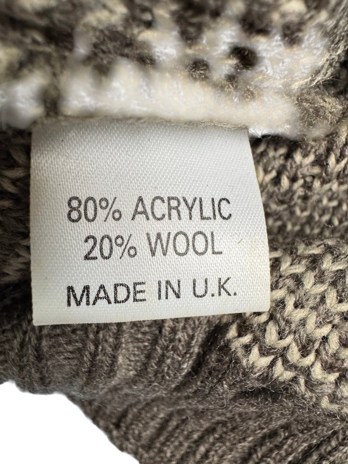 Made of 80% acrylic and 20% wool. Geometric pattern design. Made in the UK with ribbed cuffs and hem.