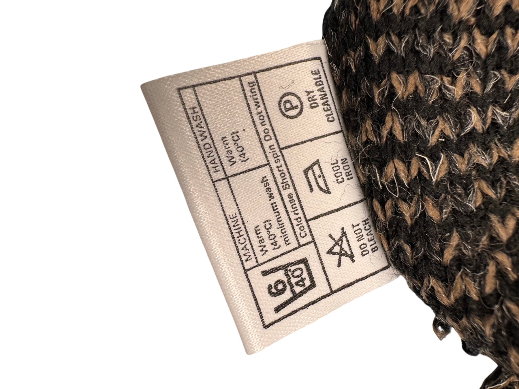 Black patterned V-neck sweater with long sleeves. Made from 90% acrylic and 10% wool. Features ribbed cuffs and hem. Made in the U.K. by Bentley Casuals.