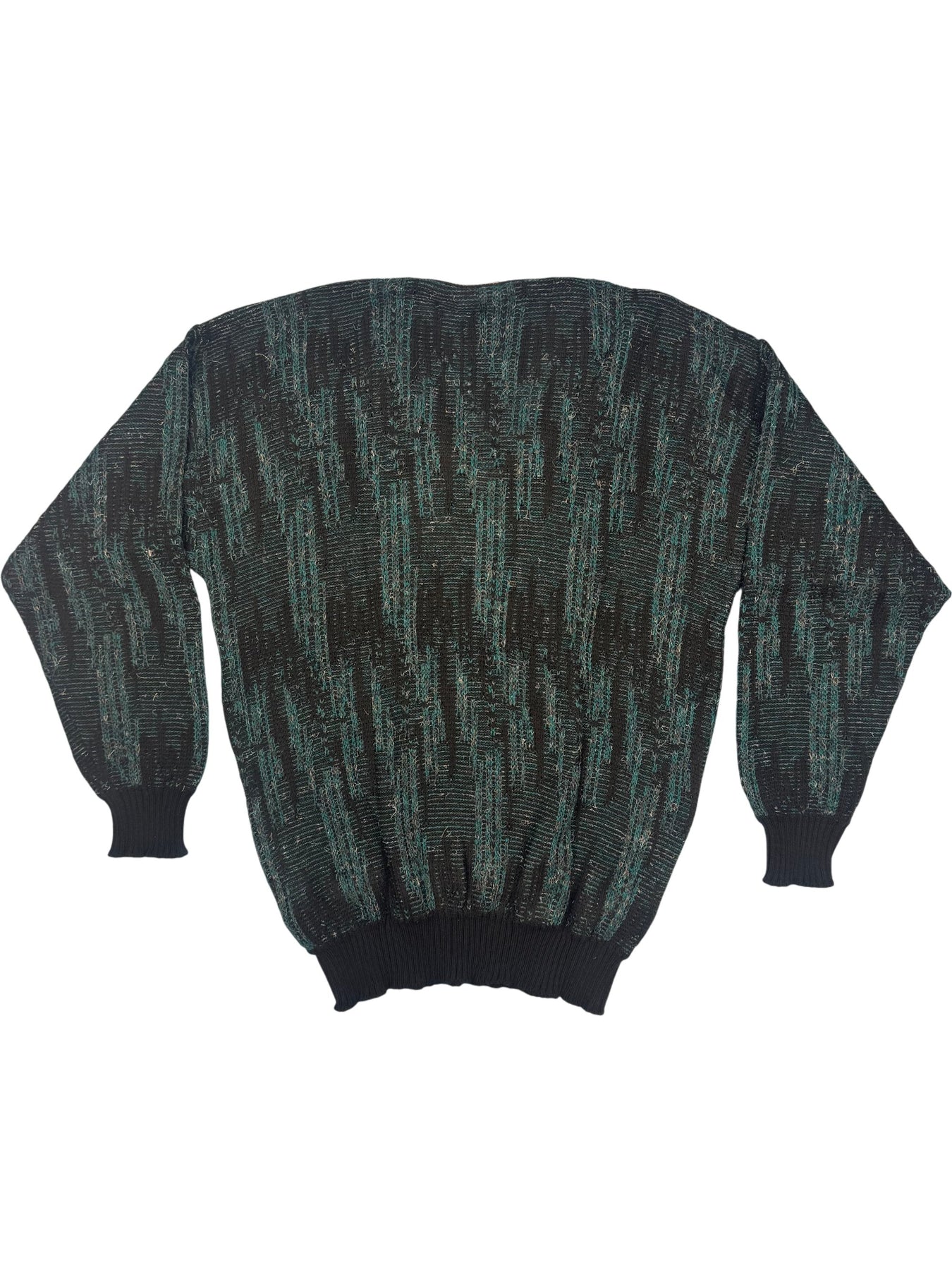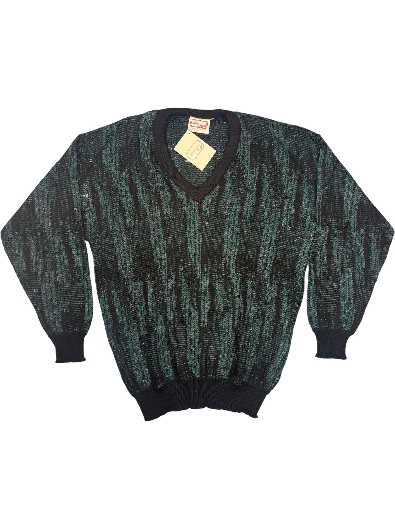 This Bentley Casuals sweater is made in the U.K. from a blend of 90% acrylic and 10% wool. It features a V-neck design with ribbed cuffs and hem. The pattern is a mix of blues and blacks, providing a distinct textured appearance.