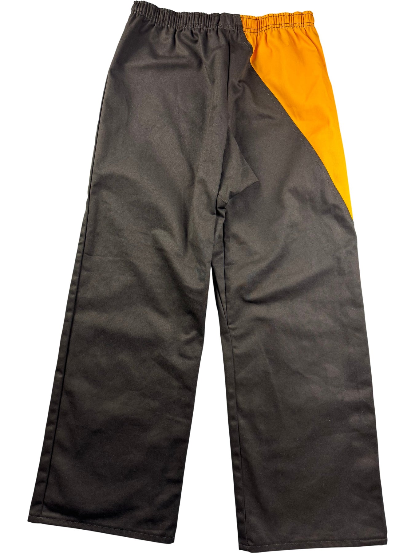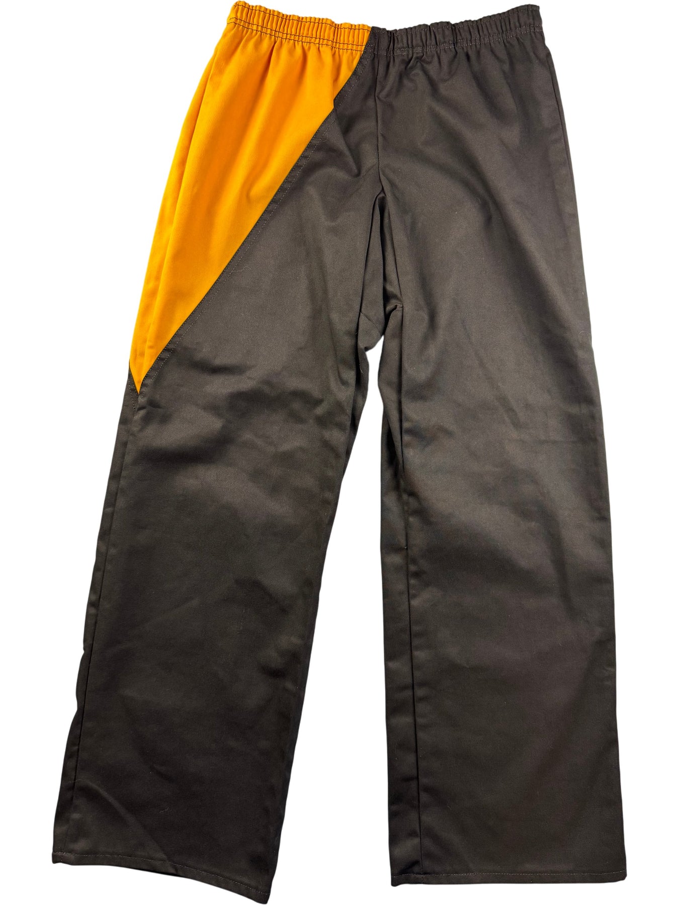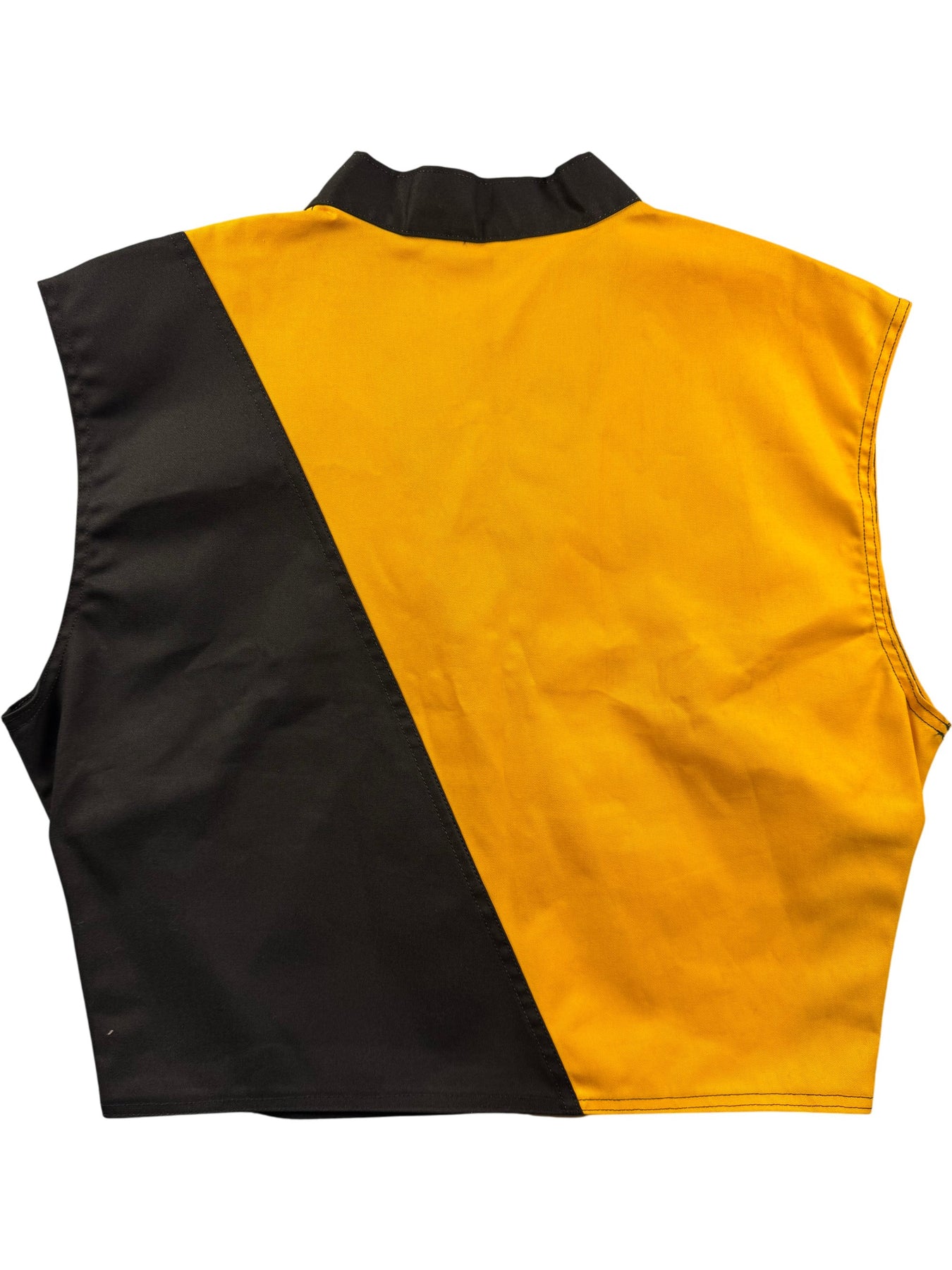 This martial arts uniform is made by Century, featuring a vibrant yellow and black colour scheme. It consists of a sleeveless top and matching pants. The fabric is a blend of 65% polyester and 35% cotton, offering durability and comfort during use. Made in the USA, this set is designed for adult size L.