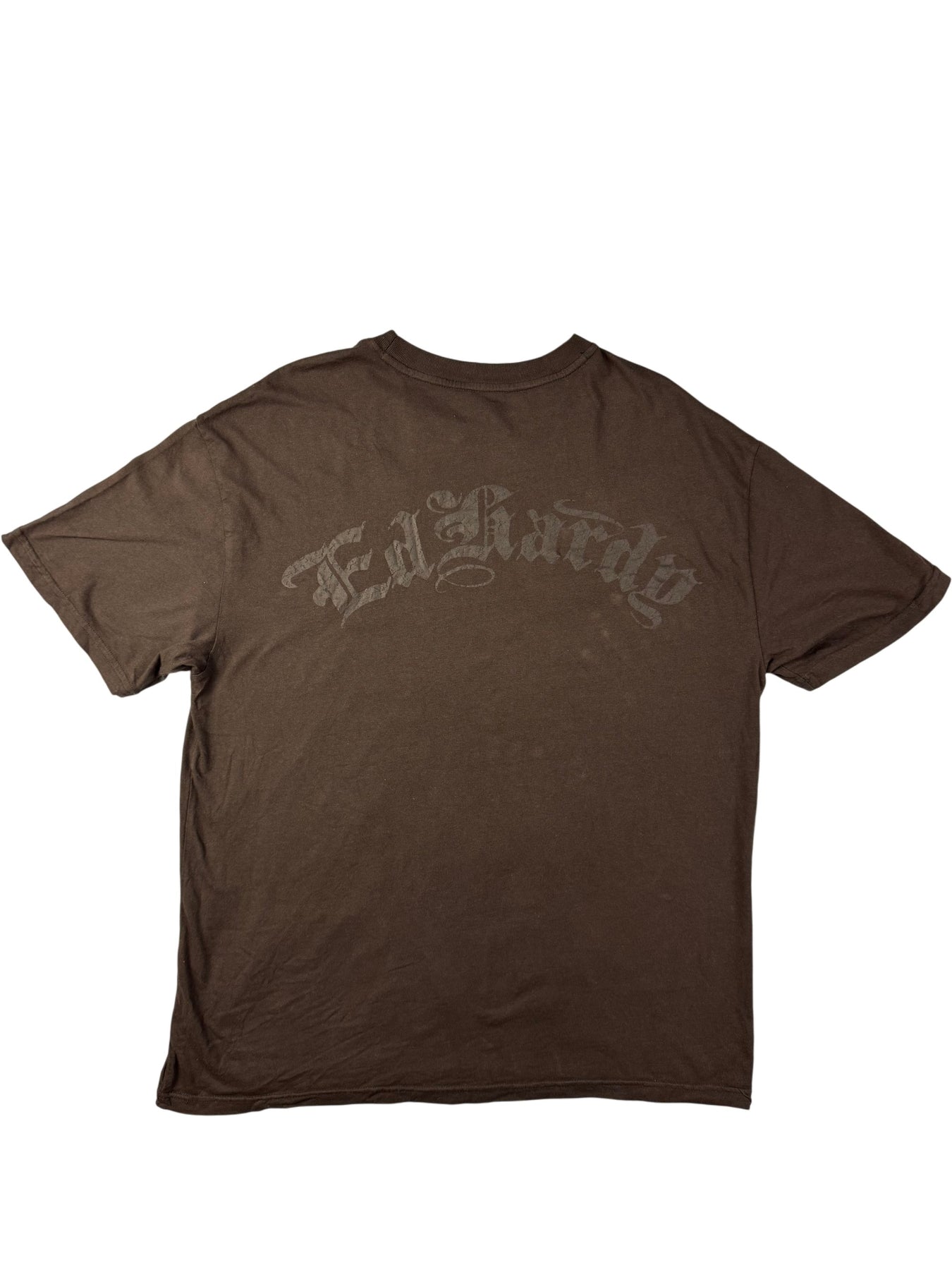 Brown short-sleeve t-shirt featuring a bold Ed Hardy skull tattoo graphic on the front. Made from soft cotton material with a crew neckline.