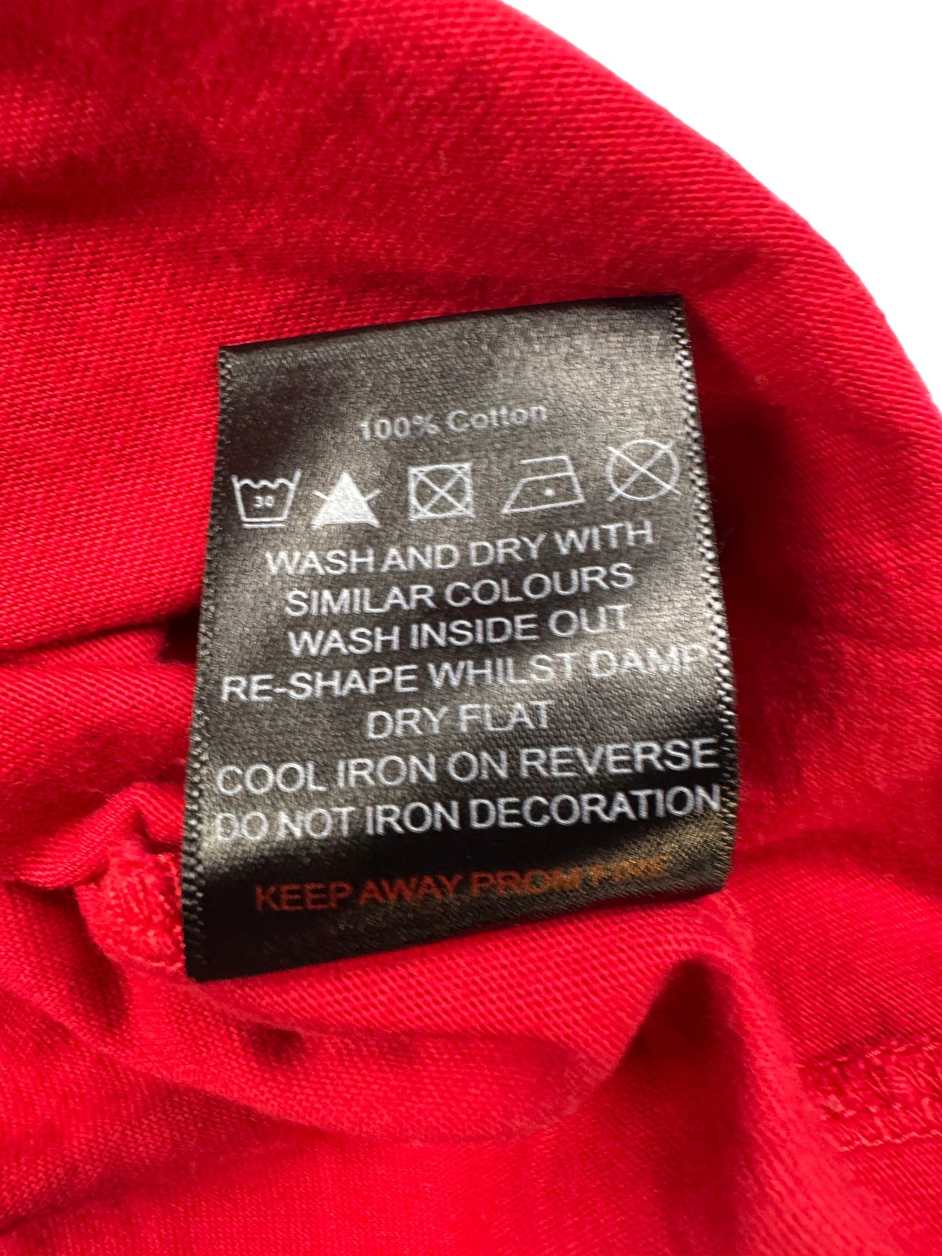 Red T-shirt with Ed Hardy logo on front. Features patterned shoulder detailing. Made from 100% cotton.
