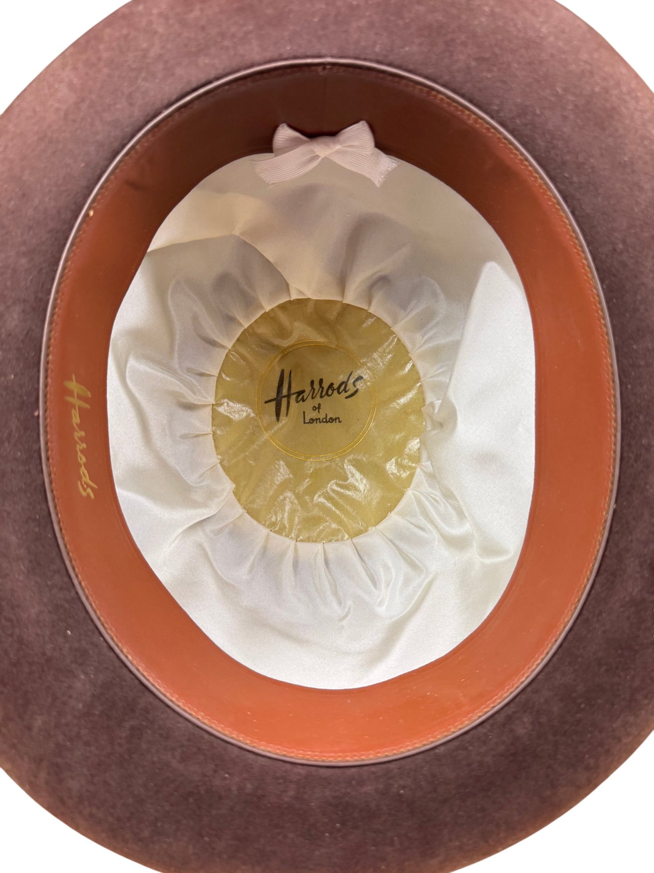 Classic bowler hat in rich brown color. Features a ribbon band accent. Designed and crafted by Harrods of London.