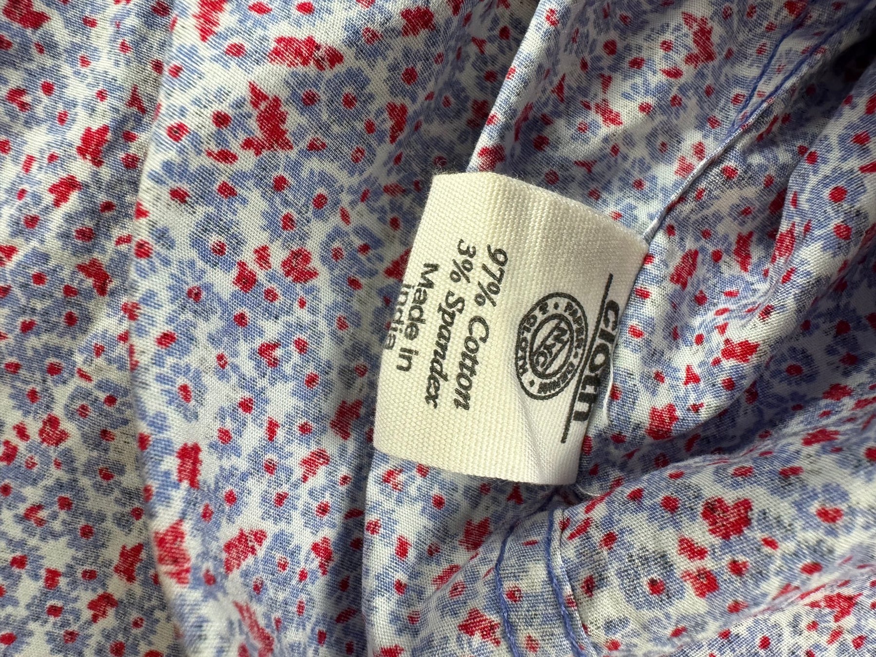 Short sleeve shirt with a floral pattern. Features a button-up front and slim fit design. Made from 97% cotton and 3% spandex for stretchable comfort.
