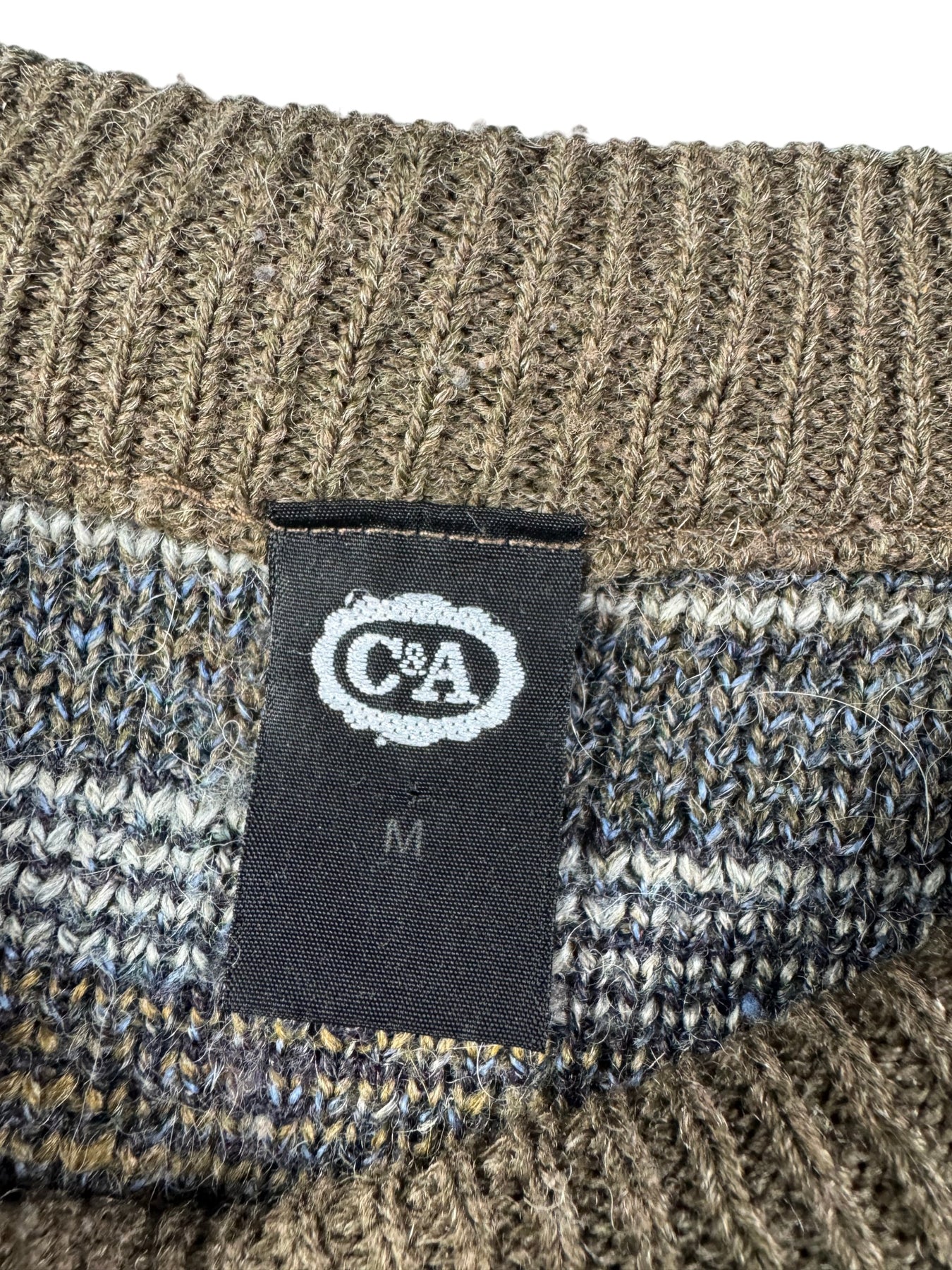Multicoloured knit sweater with geometric pattern, ribbed cuffs and hem. Made by C&A. Medium size, featuring a crew neckline.