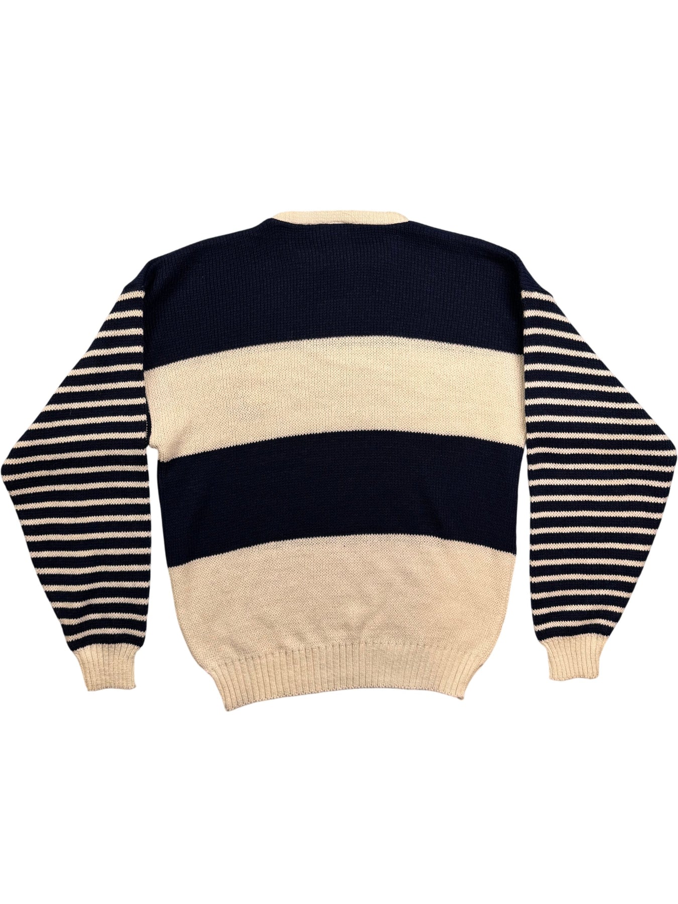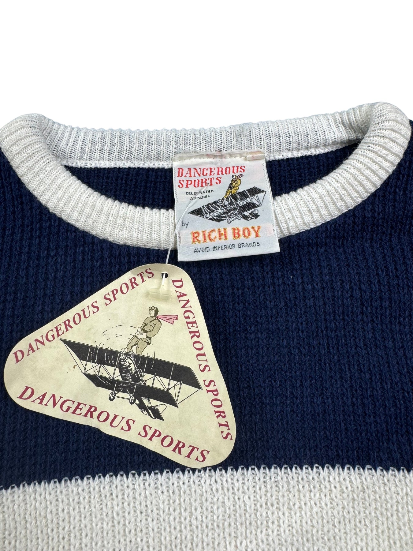 This sweater features a bold striped design with navy and white hues. It is made of a blend of 70% acrylic and 30% cotton, providing a soft and comfortable feel. The design includes a "Dangerous Sports" logo on the chest.