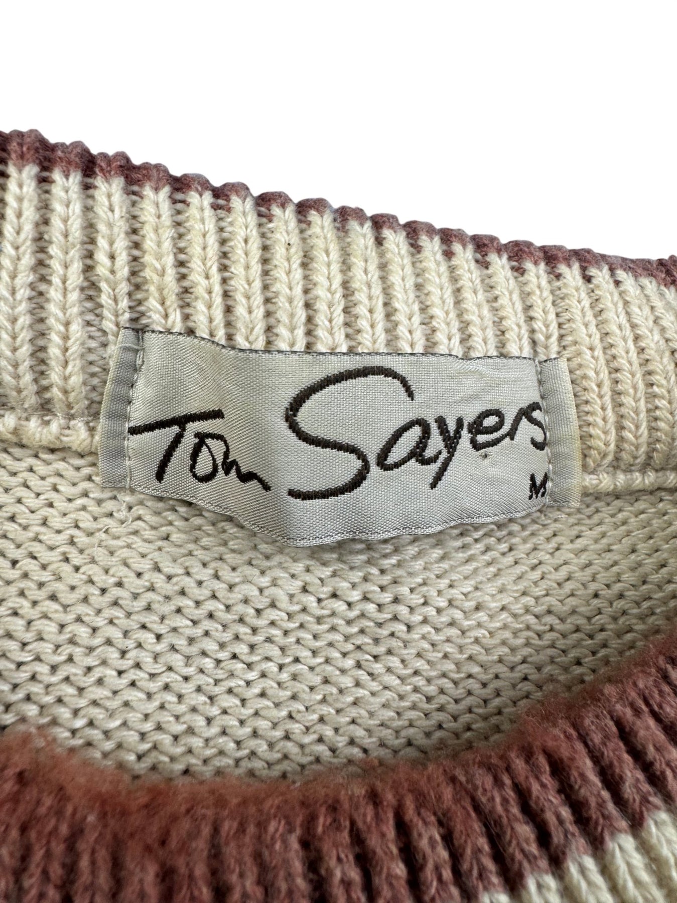Patchwork design sweater made from 50% acrylic and 50% cotton. Features a crew neckline and ribbed cuffs and hem. Multicolor geometric patterns create a distinctive look.