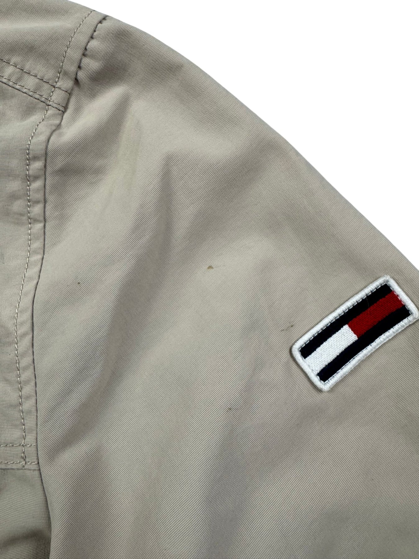 Tommy Jeans beige jacket with a front zipper closure and elastic cuffs. Features two front pockets and a Tommy Hilfiger logo patch on the sleeve. Made from 100% polyamide with a mesh lining.