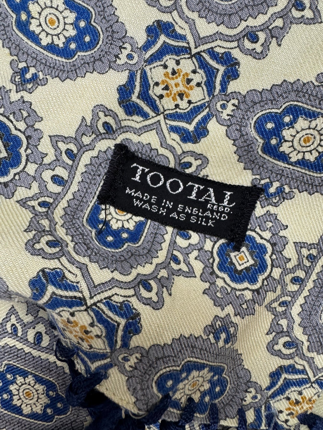 Silk scarf with a detailed patterned design, featuring blue and gray motifs. Made in England by Tootal and includes fringe detailing along the edges. The scarf is designed for an elegant appearance with a classic appeal.
