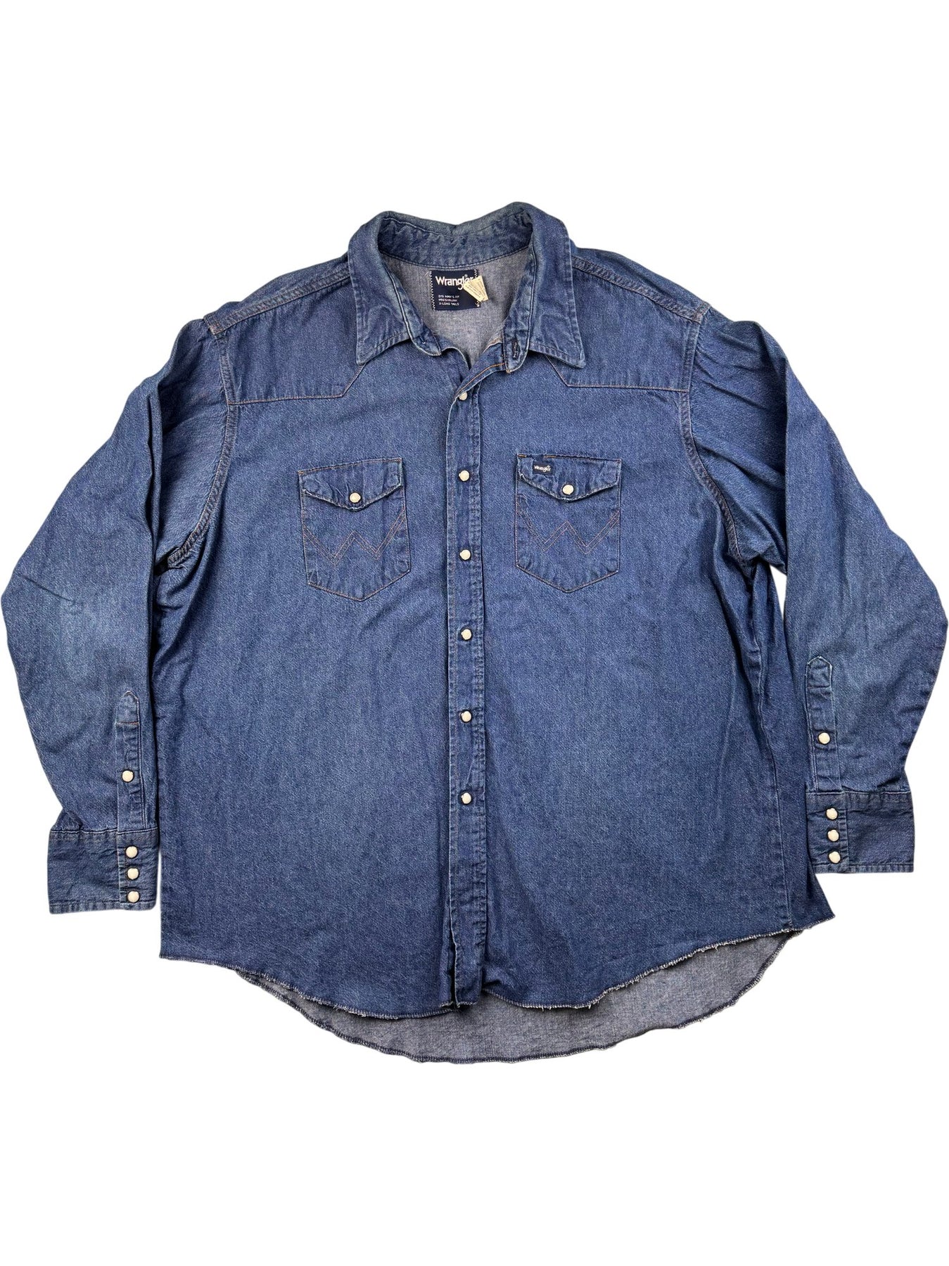 Classic Wrangler shirt crafted from durable denim fabric, featuring a button-up front and dual chest pockets. Designed with a big man's fit and preshrunk for a consistent size.