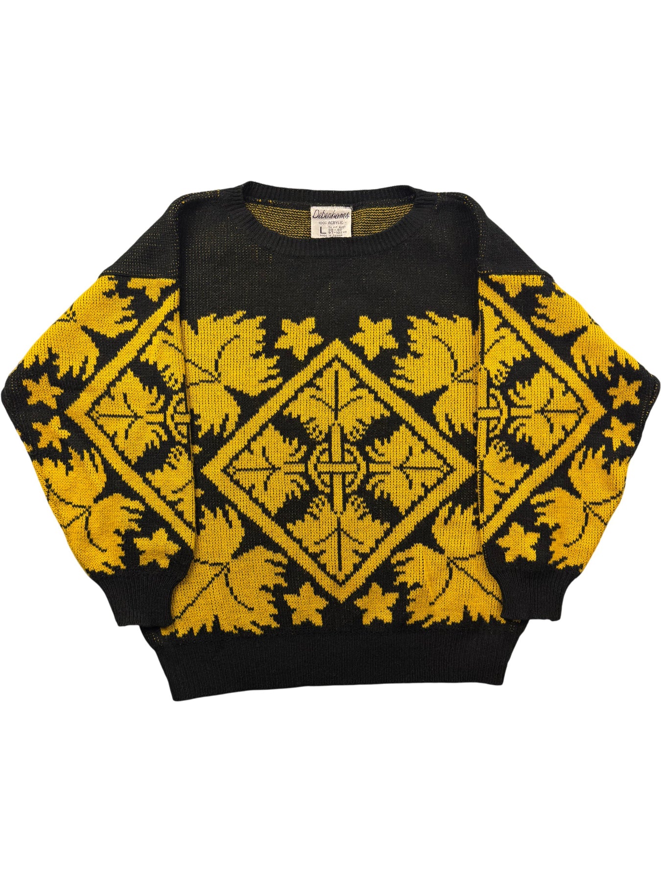Black and yellow sweater featuring a bold geometric pattern. Made from 100% acrylic, providing durability and ease of care. Crew neckline and ribbed cuffs for a comfortable fit.