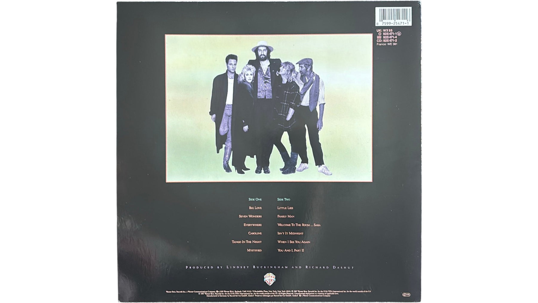 1987 vinyl record by Fleetwood Mac. Features the album "Tango In The Night" with tracks like "Big Love" and "Little Lies." Produced by Lindsey Buckingham and Richard Dashut under Warner Bros. Records.