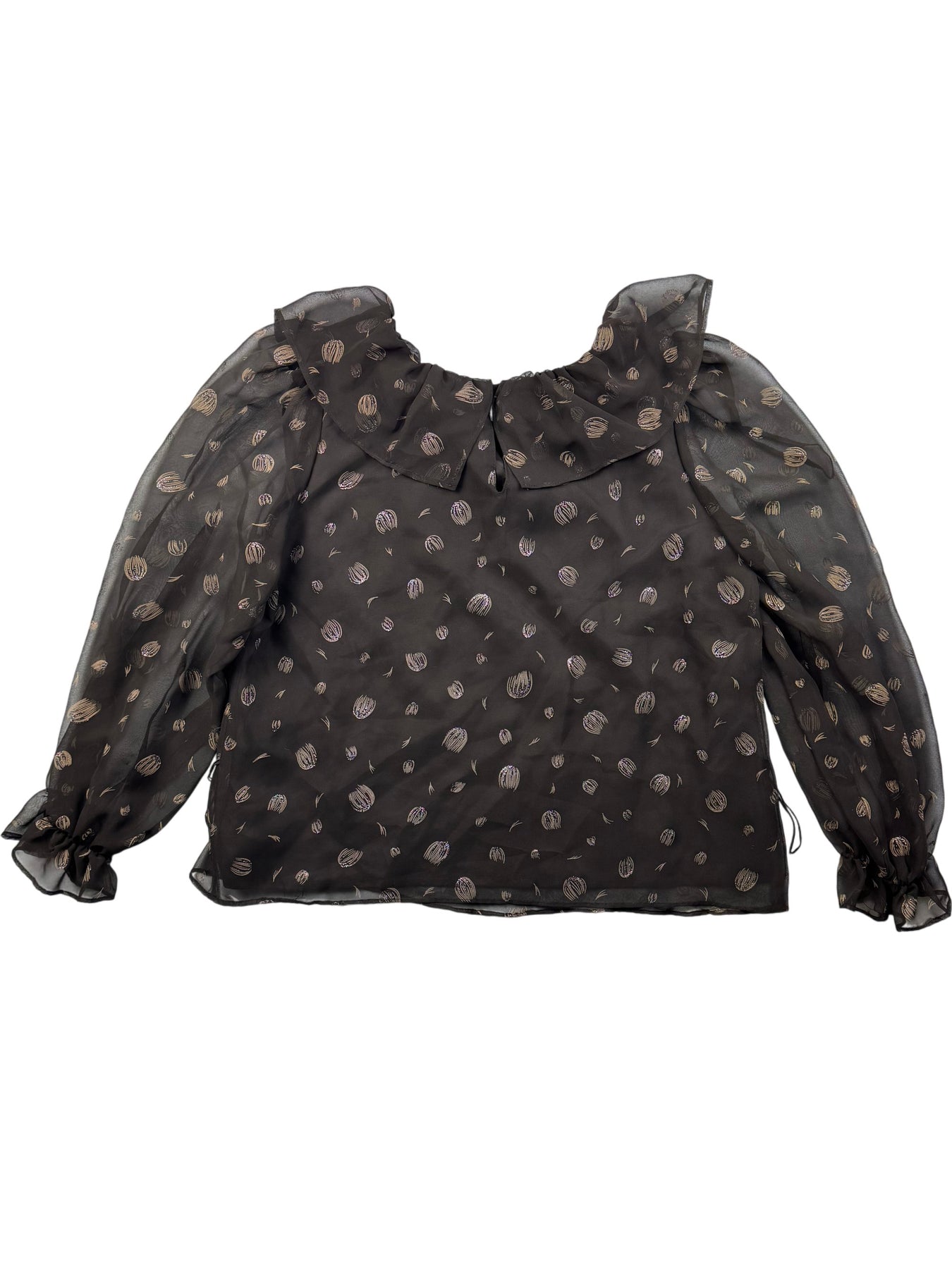 Sheer black blouse with polka dot pattern. Made from 100% polyester with a lining of 100% acetate. Features a ruffled collar and cuffed sleeves.