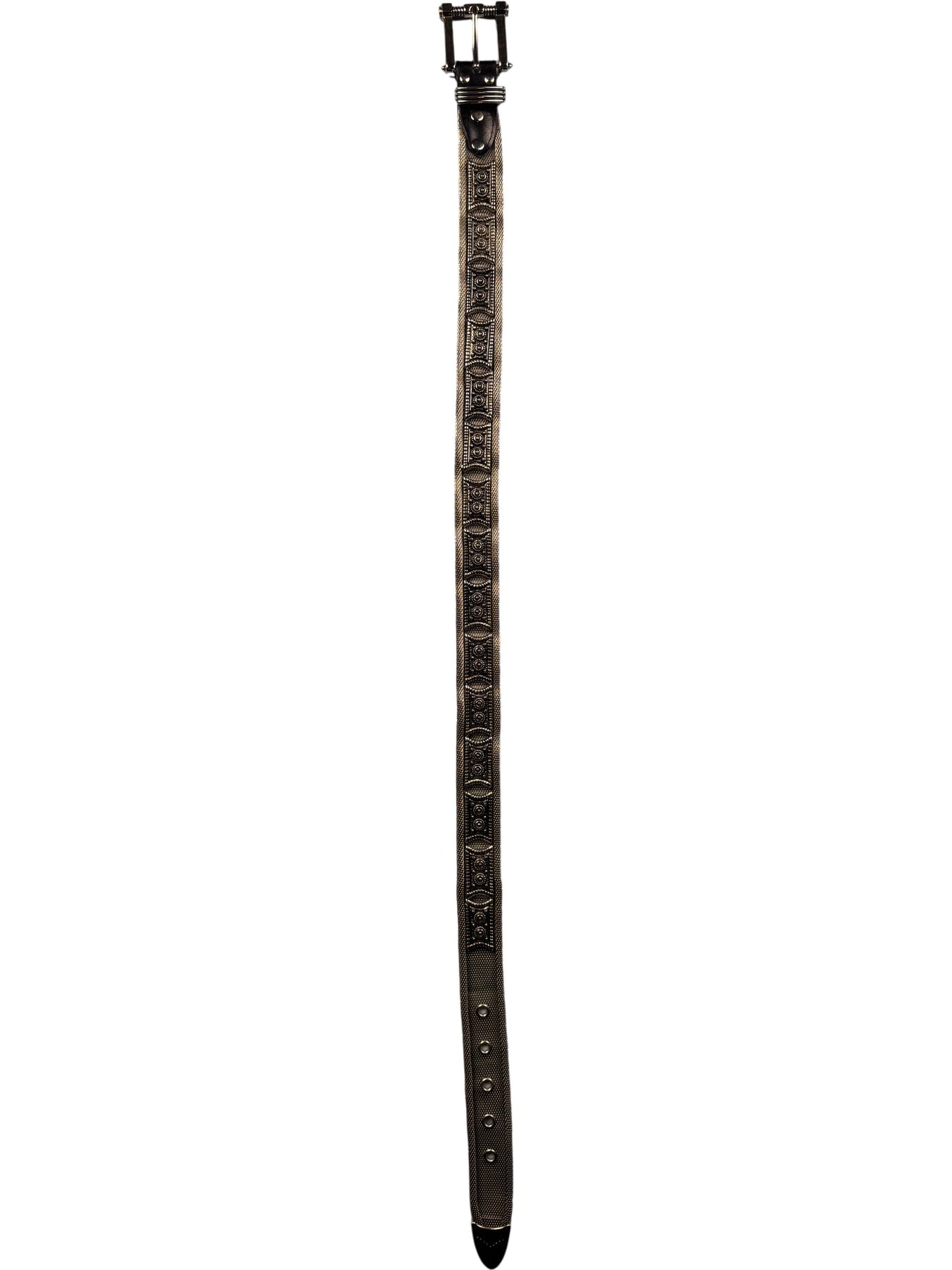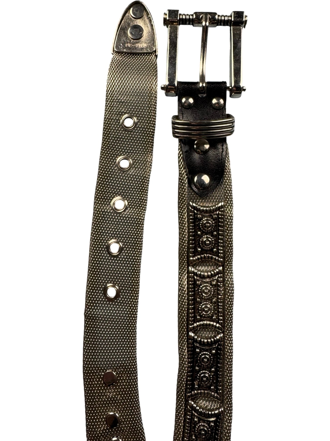 Metallic mesh construction with detailed engravings. Adjustable buckle design. Decorative studs and intricate patterns on the strap.