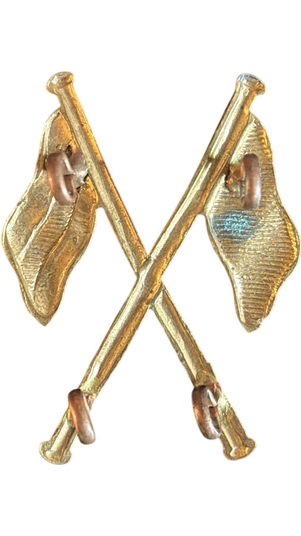 Gold tone military pin featuring crossed signal flags. Made from metal for durability. Pin back for easy attachment.