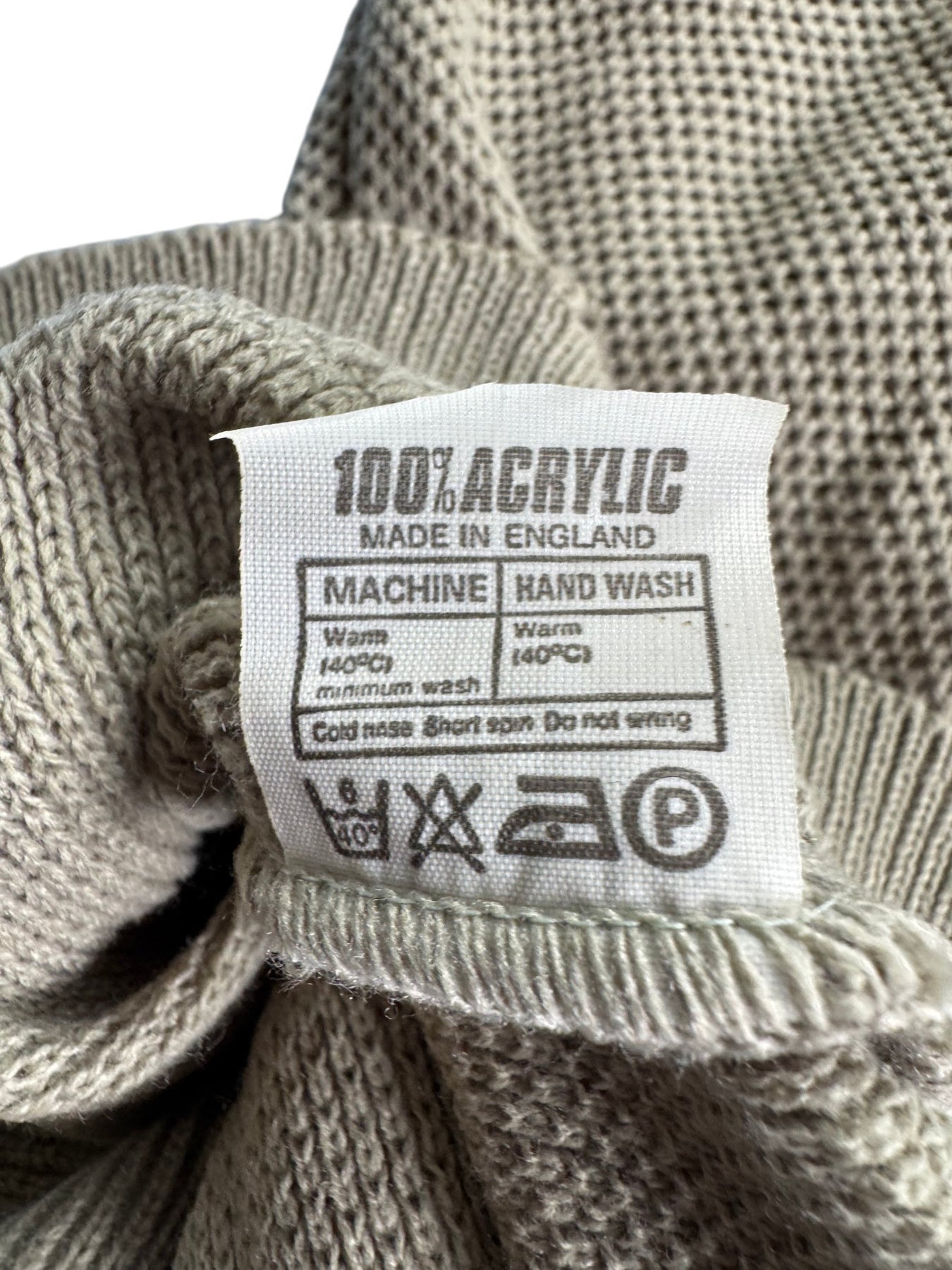 Beige V-neck knit sweater crafted from 100% acrylic for comfort and durability. Features ribbed cuffs and hem for a snug fit. Made in England, this sweater is machine and hand washable.
