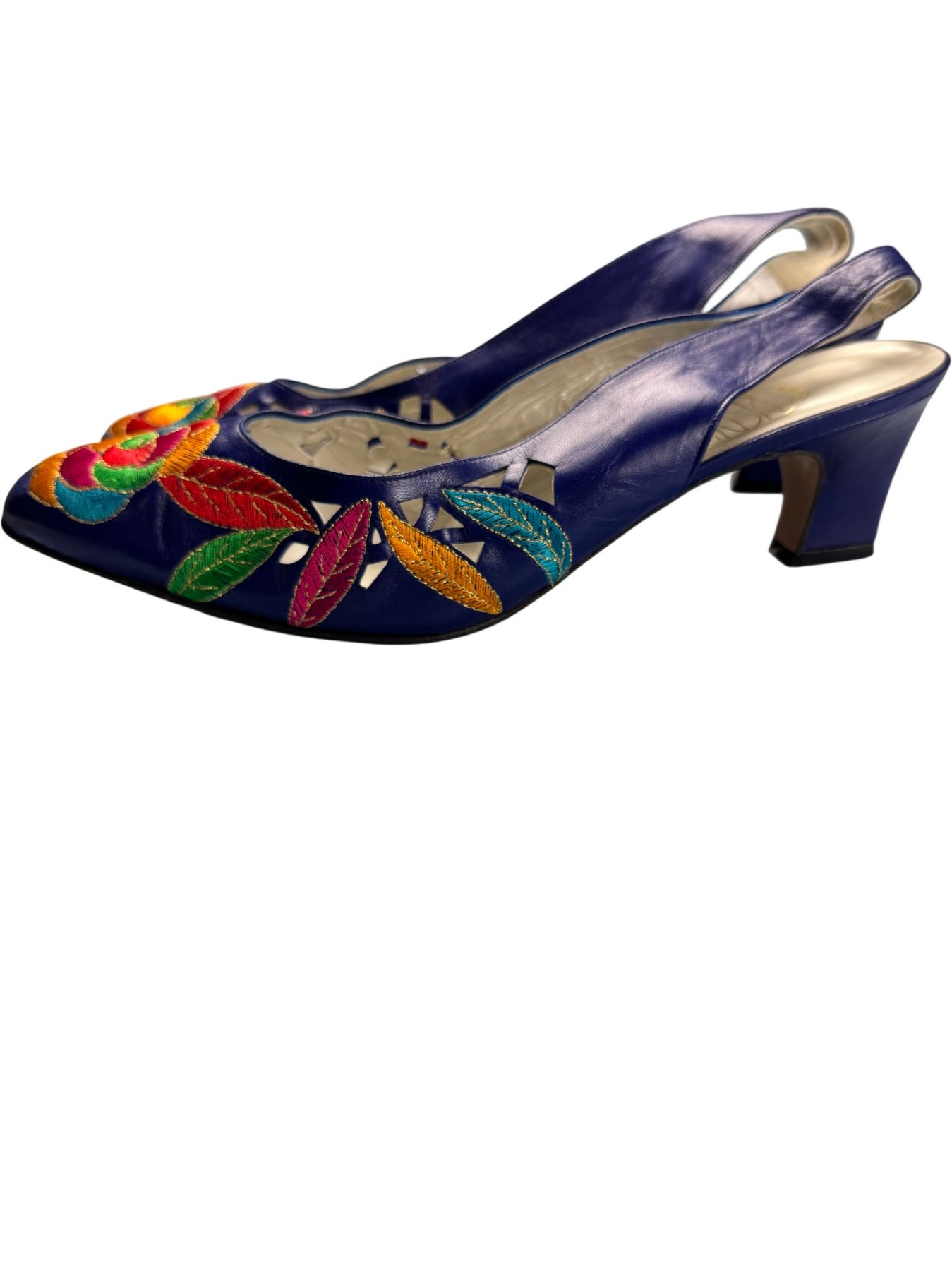 Blue slingback heels with vibrant multicolour floral embroidery. Features a perforated design and pointed toe. Made of genuine leather with a leather sole. Made in Italy.