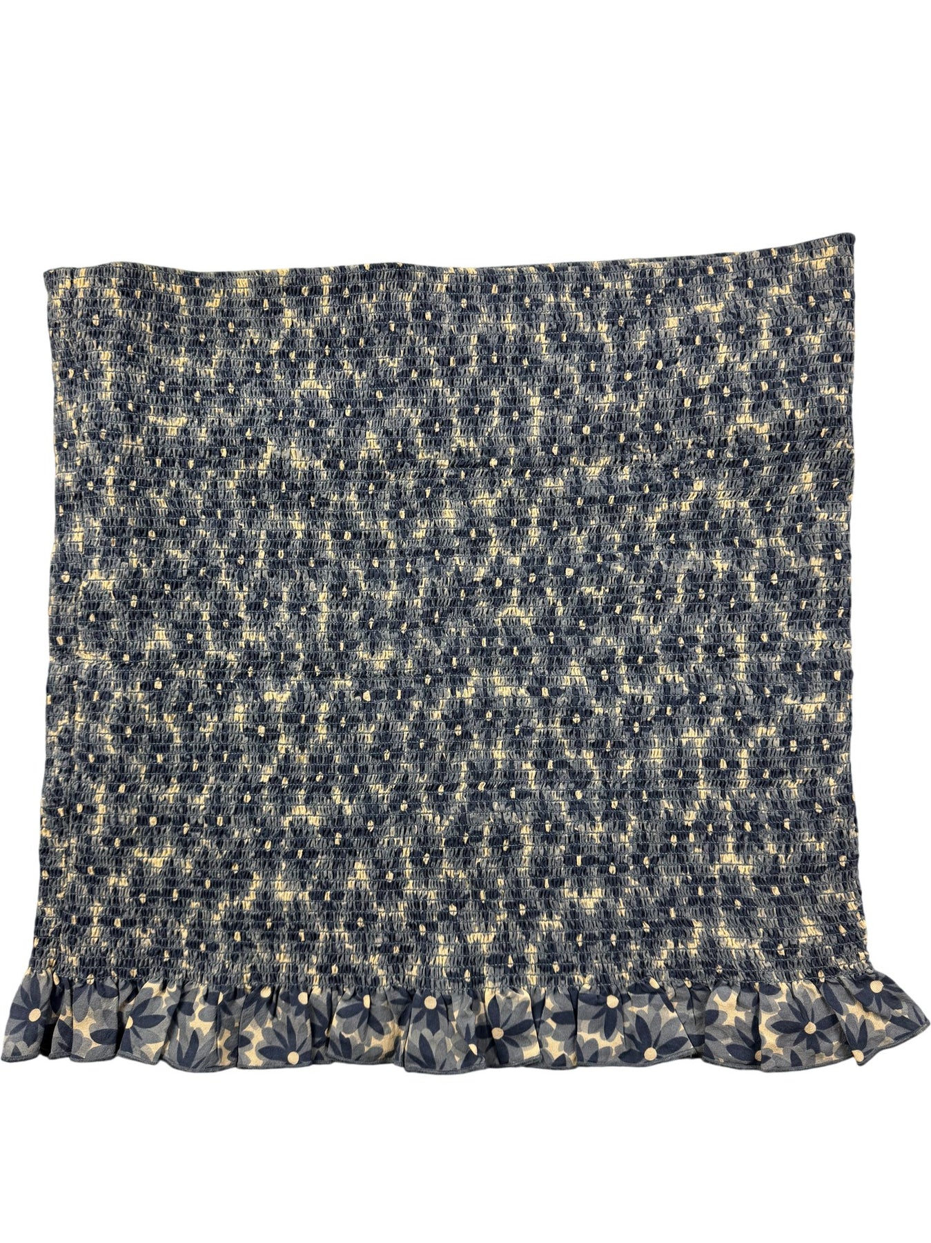 This DKNY skirt is crafted from 100% silk, featuring a blue floral pattern with a smocked texture. The ruffled hem adds a stylish touch.