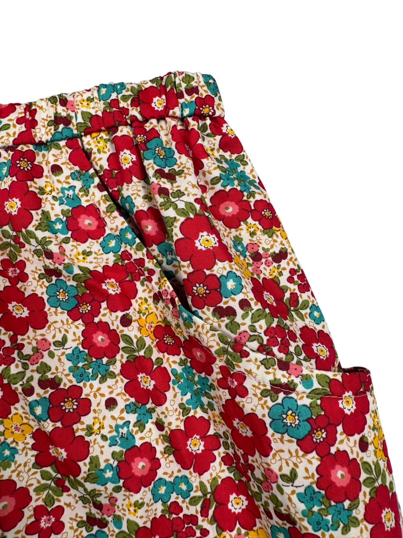 A-line skirt featuring a vibrant floral pattern with an elastic waistband. Made from lightweight, breathable fabric for comfortable wear.