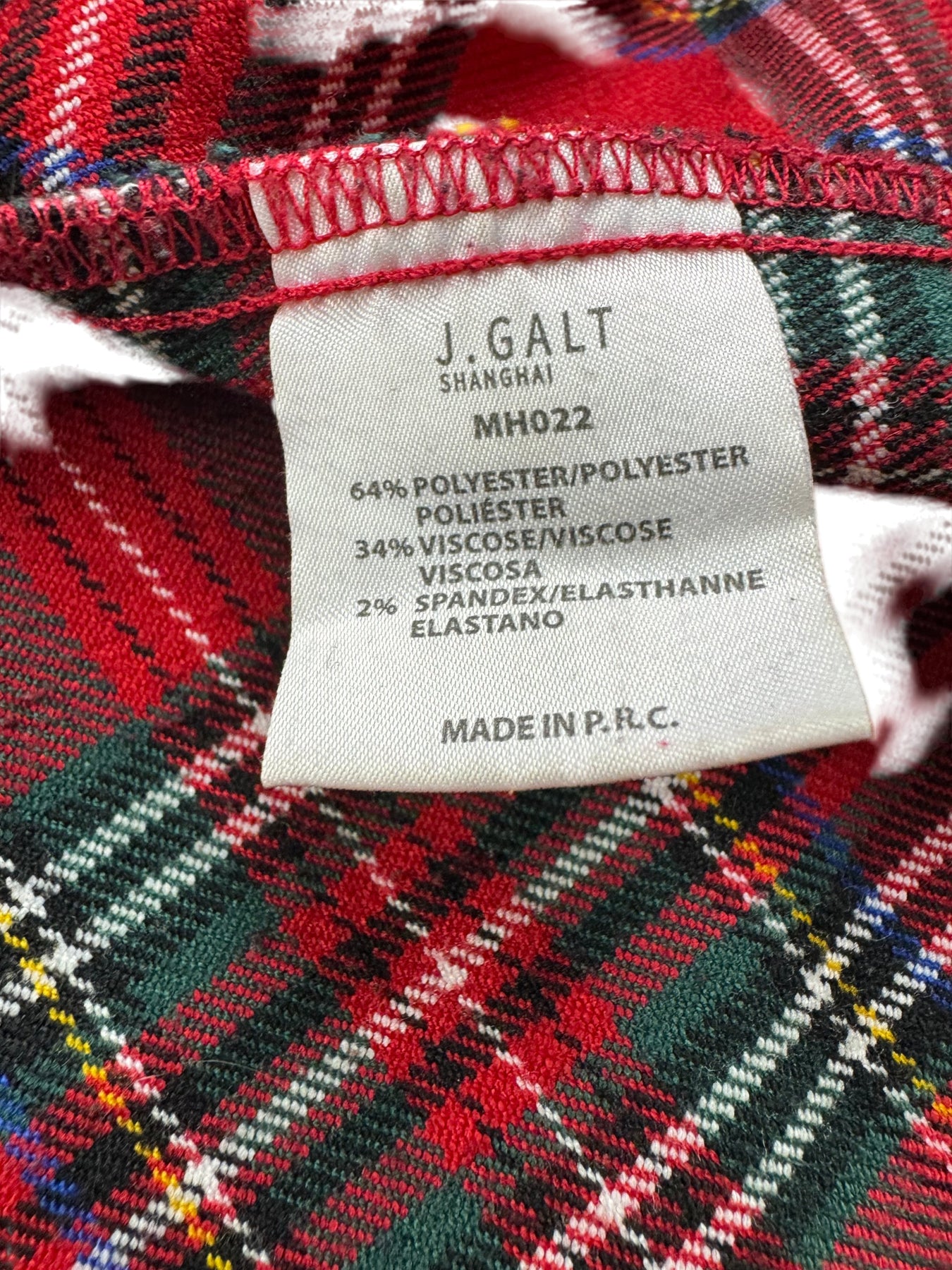 Classic tartan pattern in red and green. Made from 64% polyester, 34% viscose, and 2% spandex for comfort and flexibility. Features a pleated design with a back zipper closure.