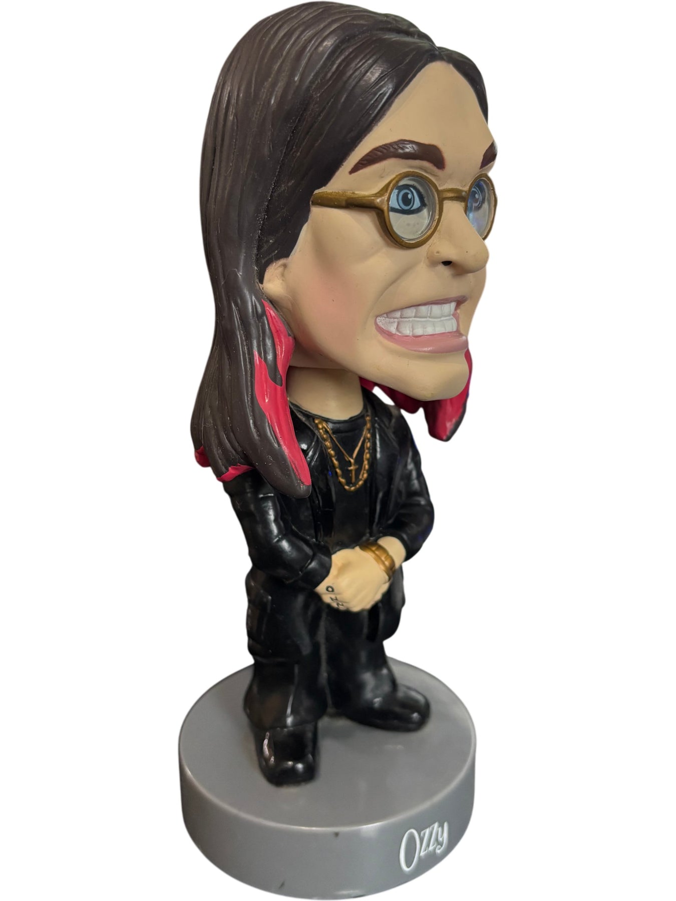 This bobblehead figure features Ozzy with detailed facial features and accessories. Made of durable plastic with a stable base, ideal for display. The design includes iconic hairstyle and attire, capturing a distinct personality.