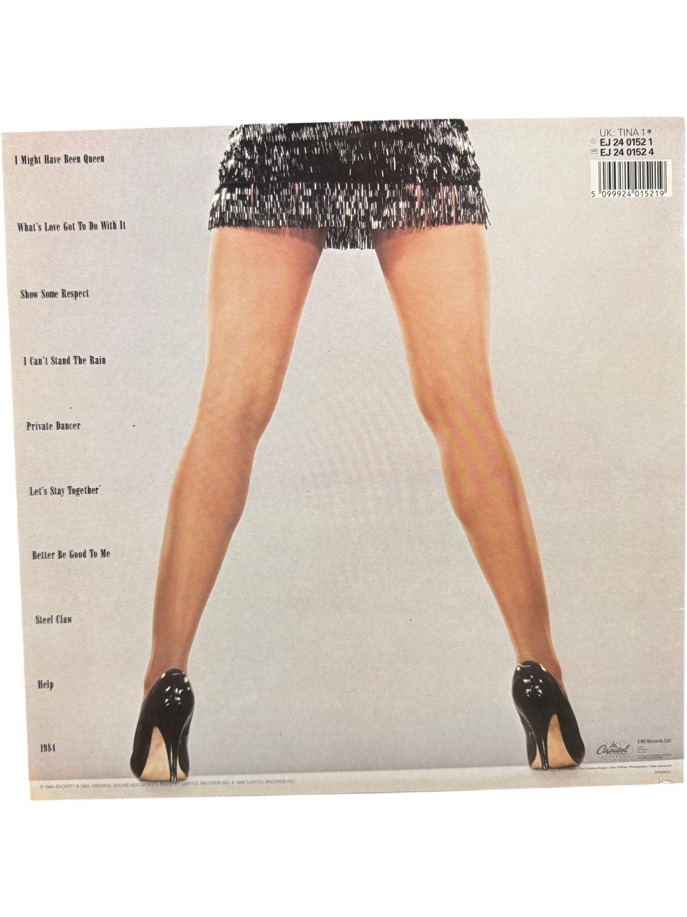 1984 vinyl record featuring Tina Turner's album 'Private Dancer'. Includes tracks such as 'What's Love Got To Do With It' and 'Better Be Good To Me'. Produced by Capitol Records.