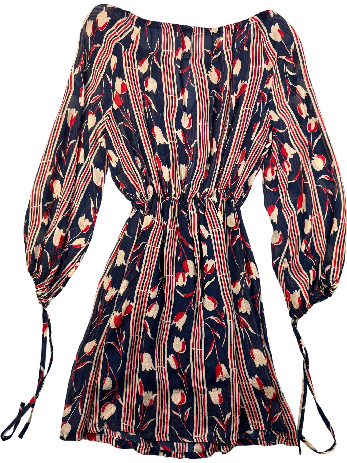1970s dress with a unique floral and striped pattern. Features long sleeves with adjustable ties. Elastic waistband for a fitted look.
