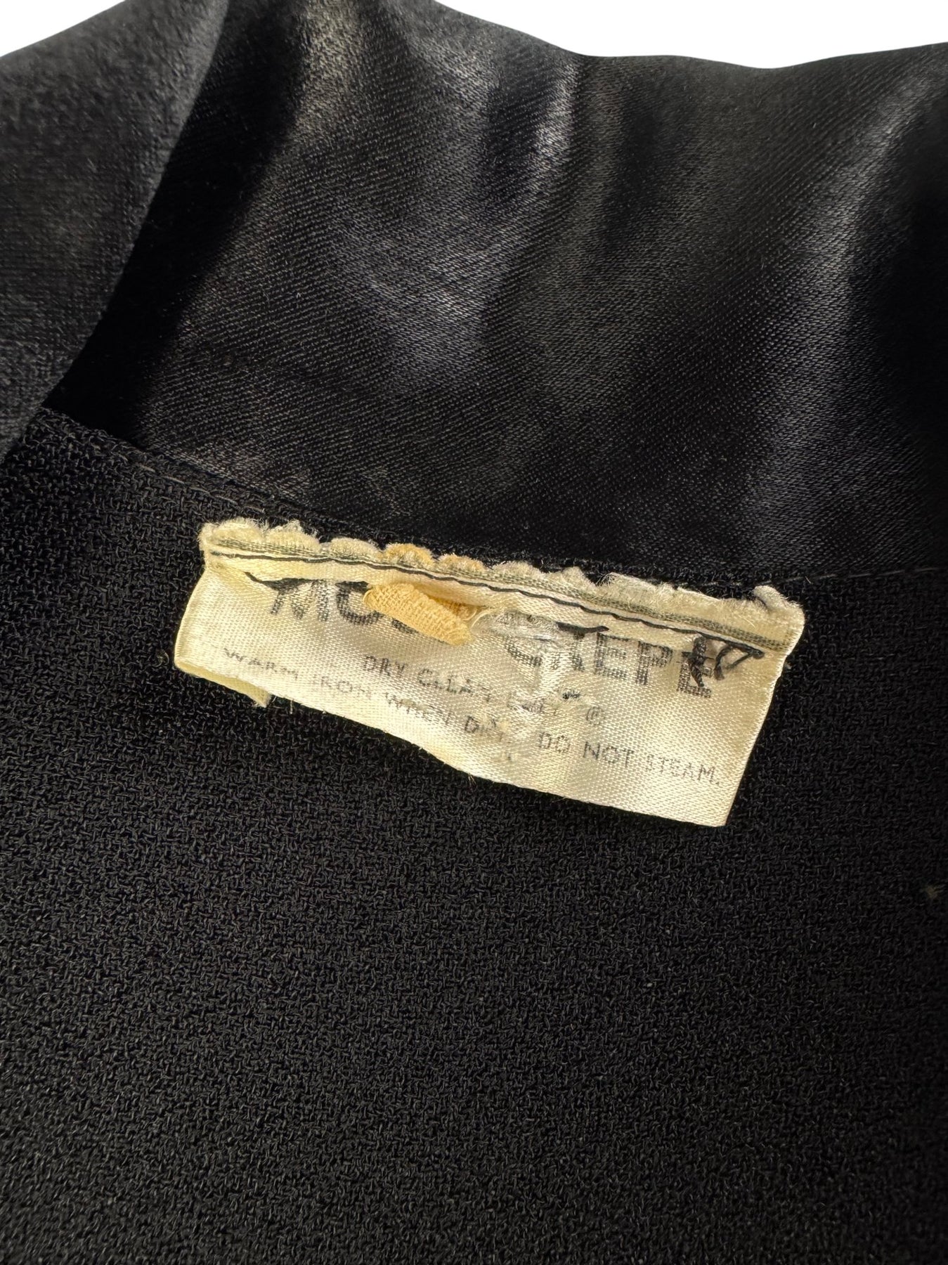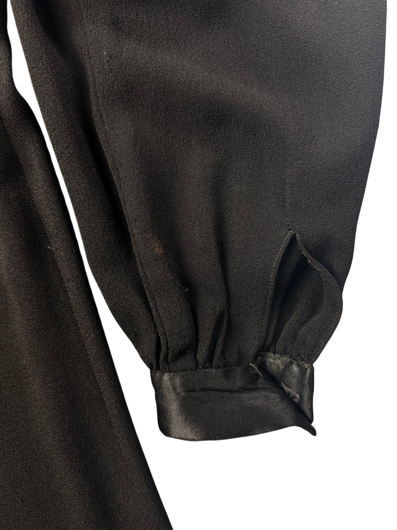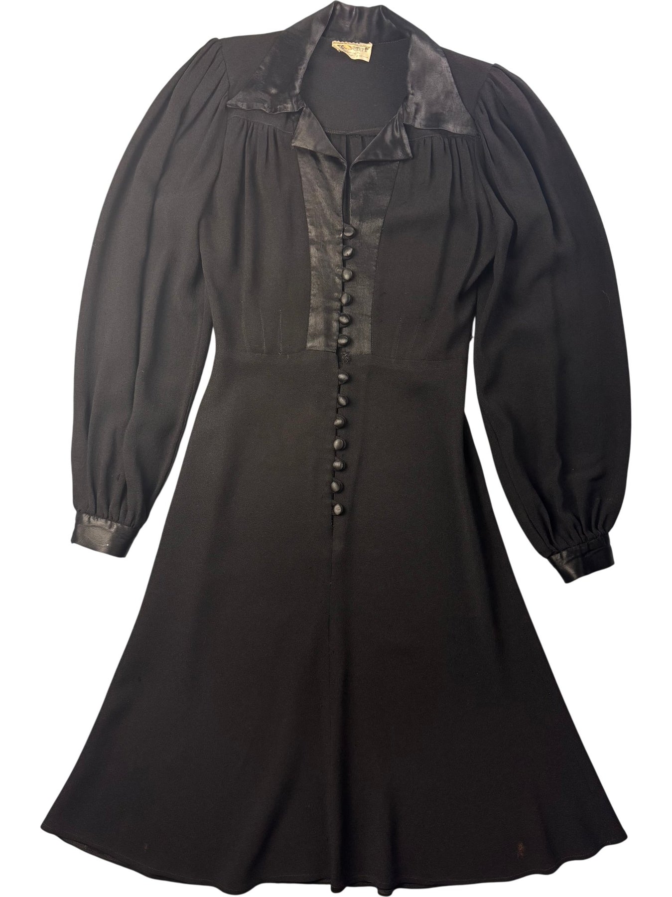 Please note- This dress is part of an Ozzie Clark collection, with label removed - hence the price. Black dress with satin collar and cuffs. Long sleeves and button front detail. Features a fitted waistline and A-line silhouette. Made of lightweight fabric.