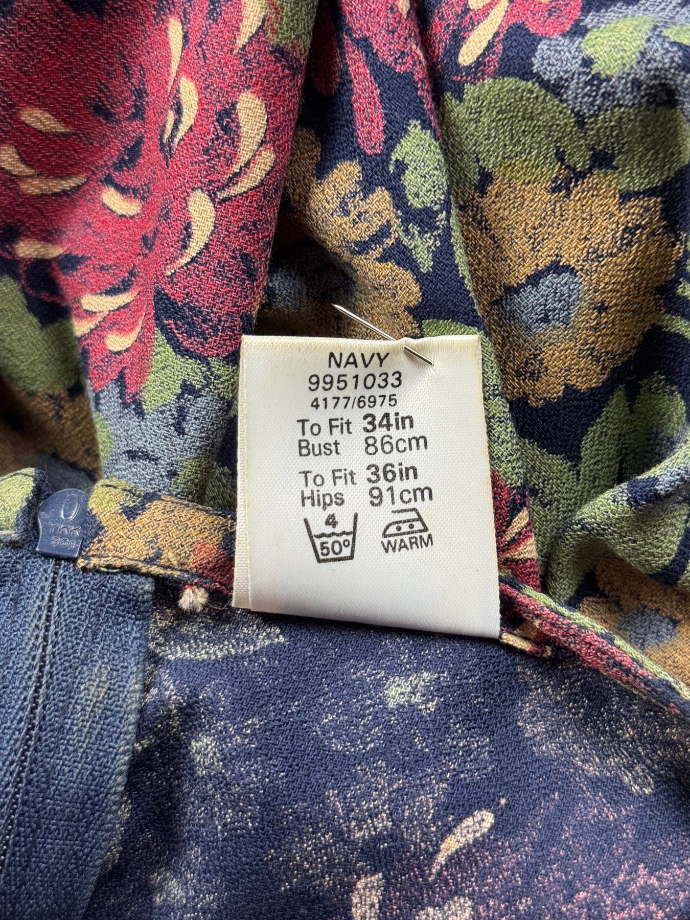 Vintage BHS dress made in Britain, featuring a vibrant floral pattern. Composed of 50% cotton and 50% modal fabric for a soft feel. It includes long sleeves and a matching fabric belt, along with a round neckline and a back zipper closure.