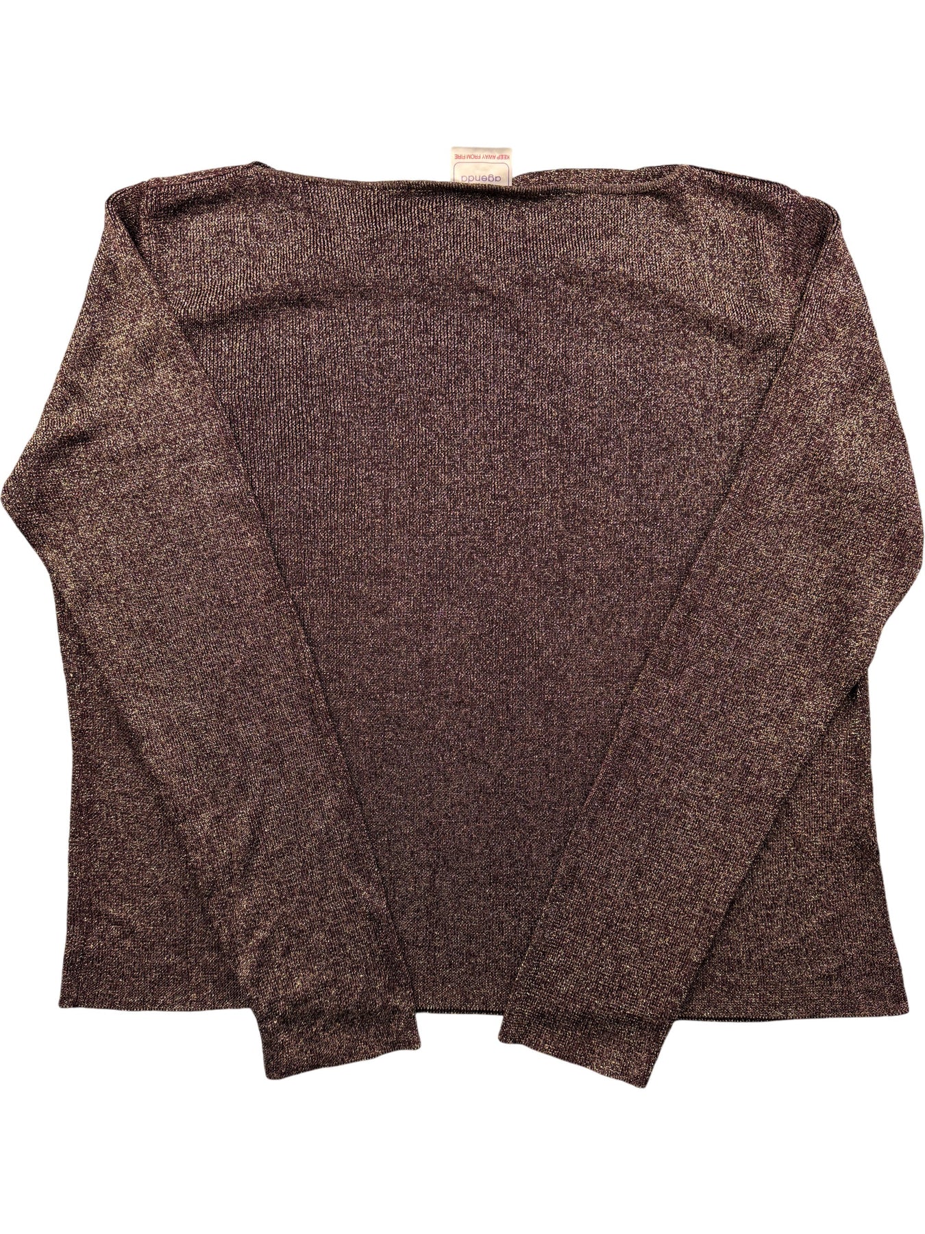 This sweater features a metallic knit design crafted from 48% ramie, 44% viscose, 5% nylon, and 3% metallic fibers. It has long sleeves and a round neckline, providing a comfortable and stylish fit.